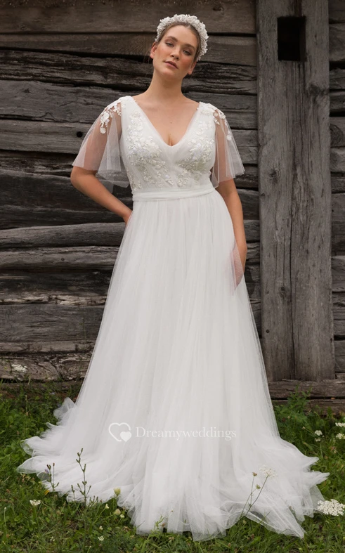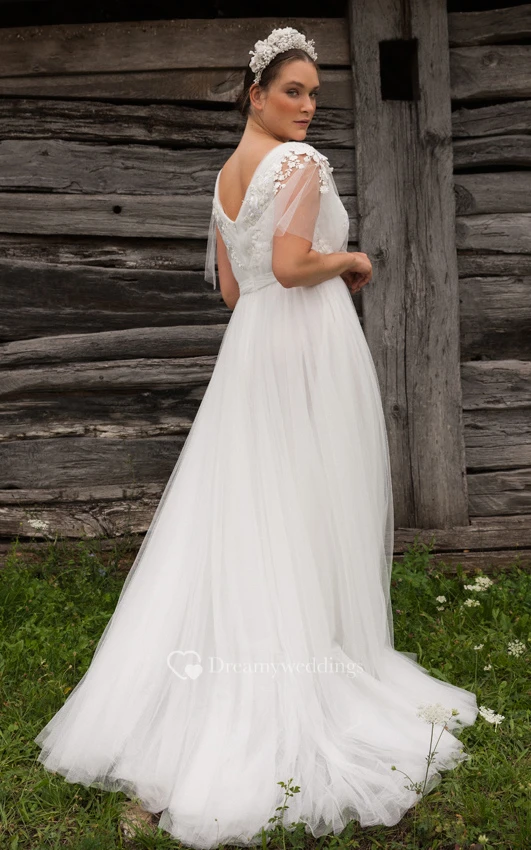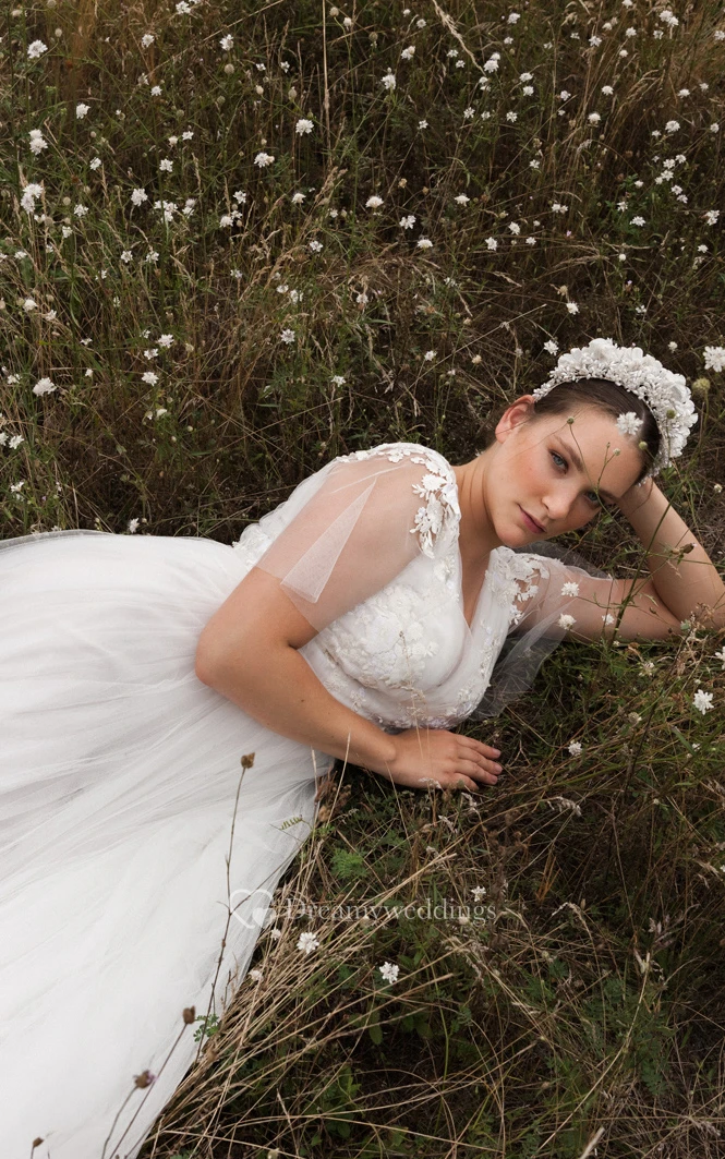 Romantic Tulle Floor-length Half Sleeve A Line Open Back Wedding Dress with Appliques
