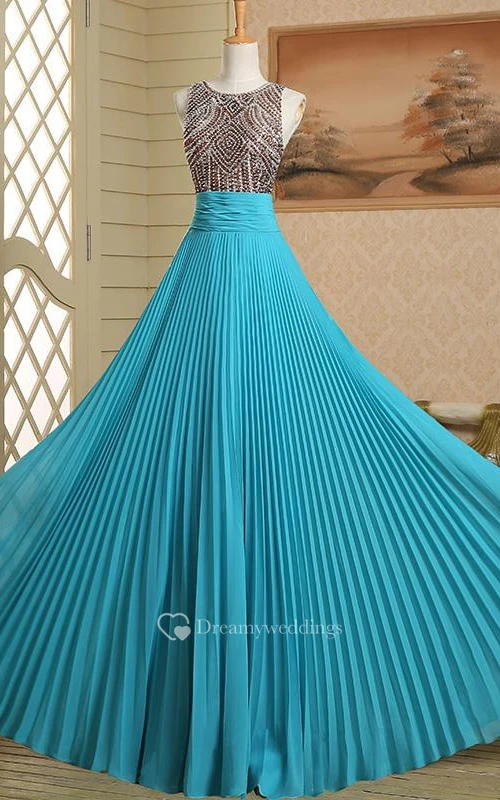 Round Neck A-Line Beading Ruched Long Prom Dress