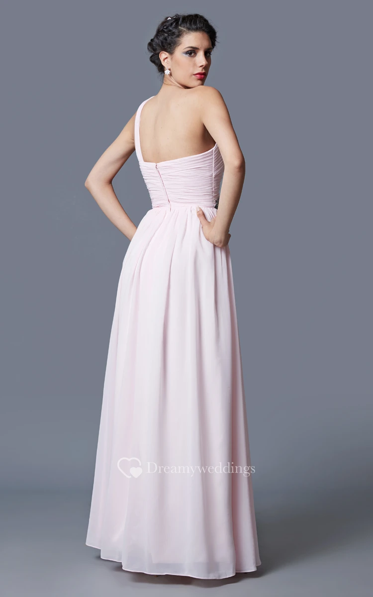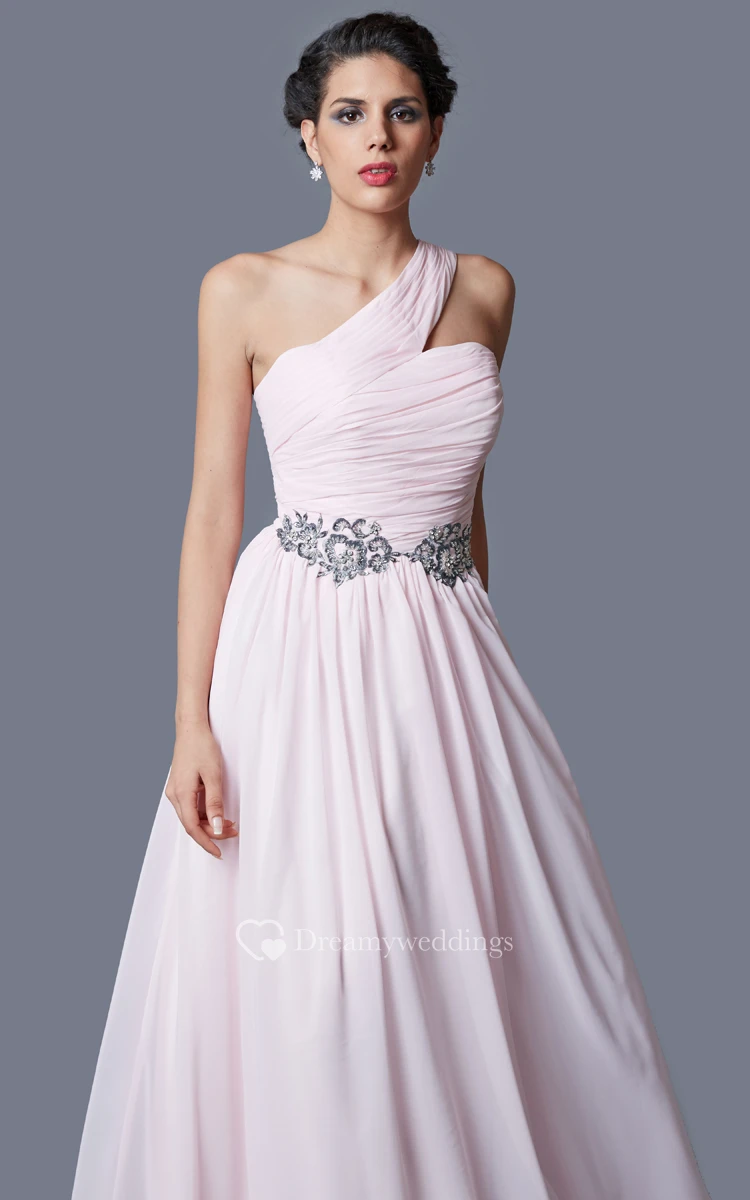 Ruched One Shoulder A-line Chiffon Gown With Beaded Belt
