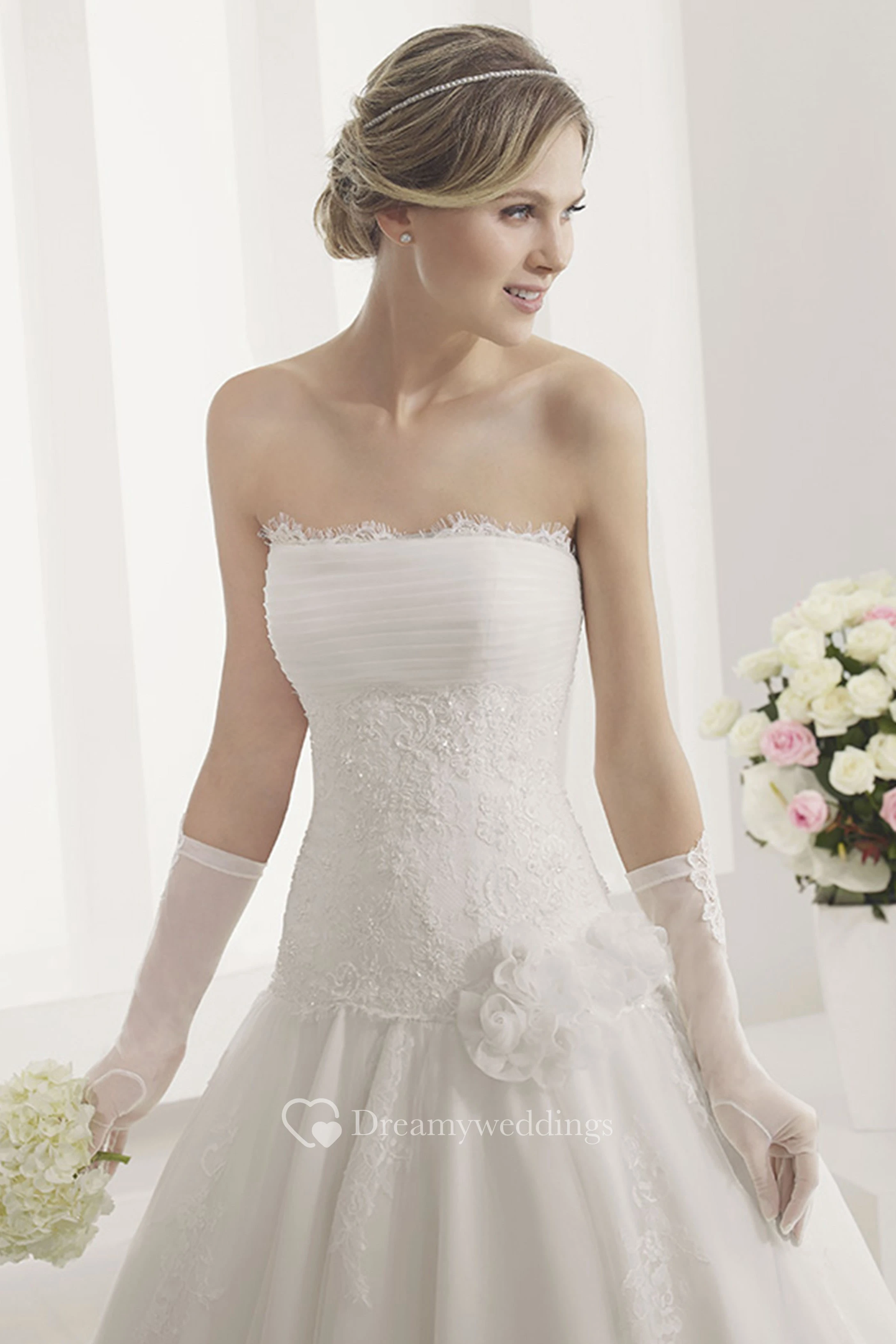 Ruched Top Lace Drop Waist Ball Gown With Organza Flower