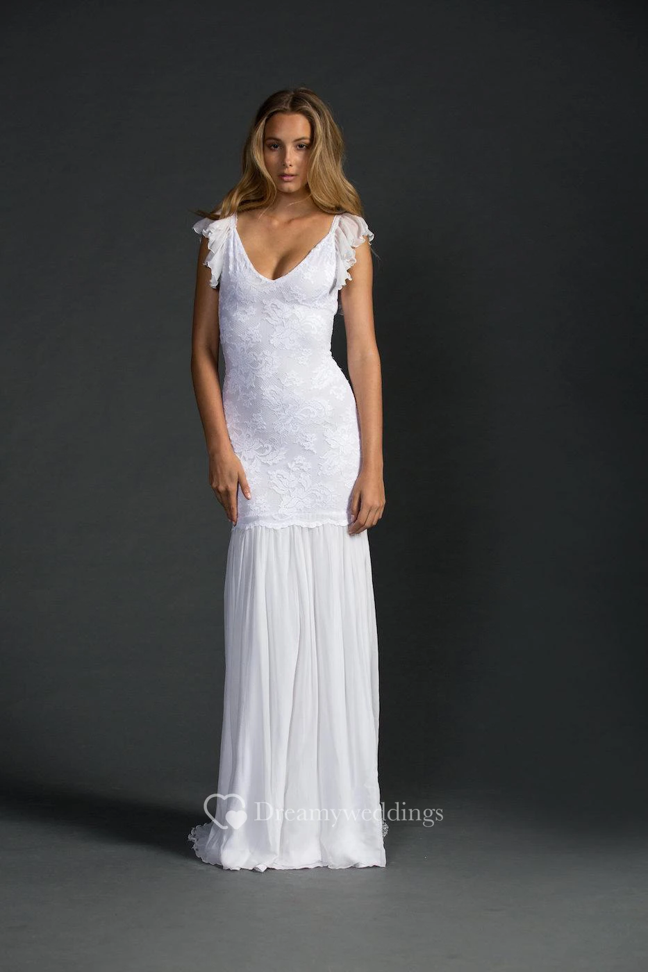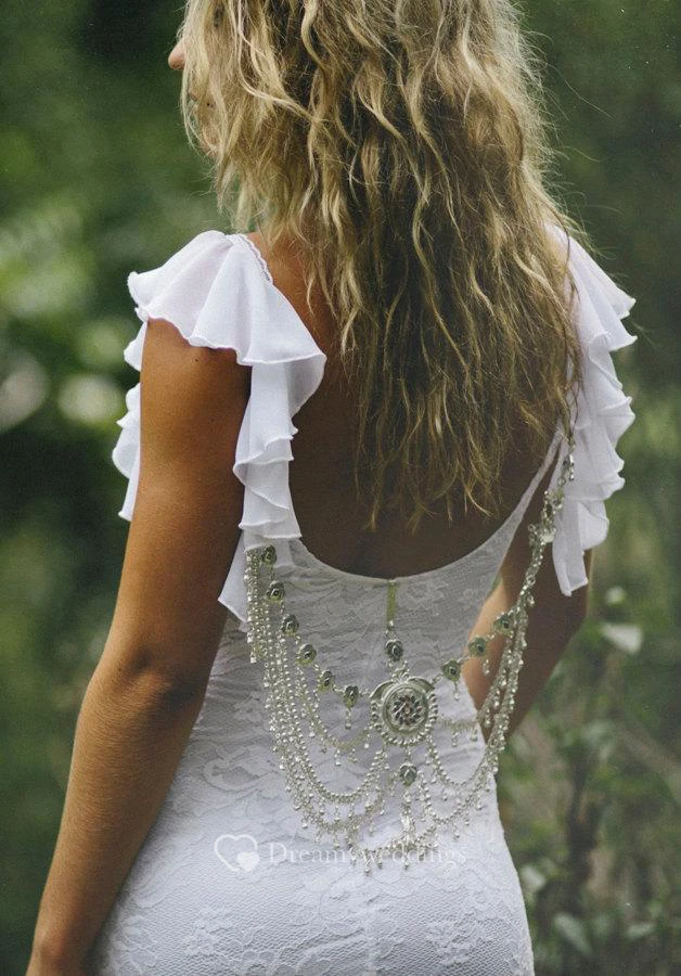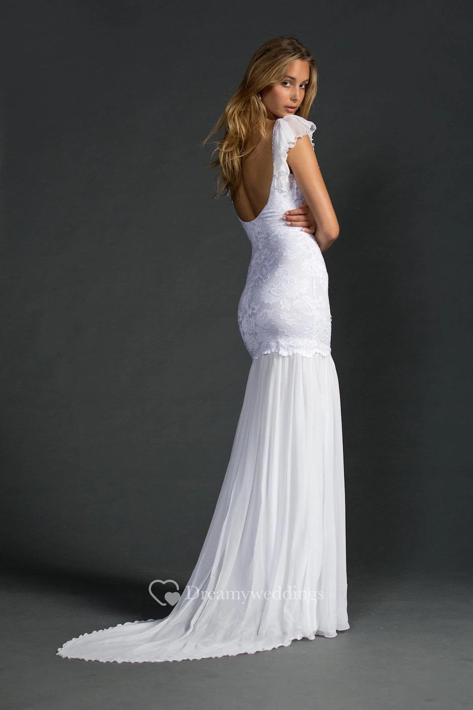 Ruffled Cap Sleeve V-Neck Mermaid Chiffon Dress With Low-V Back