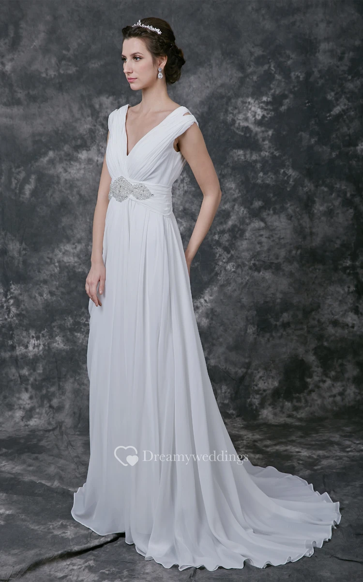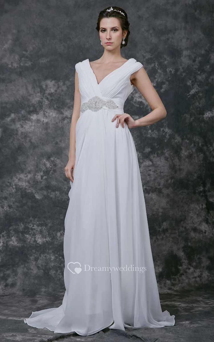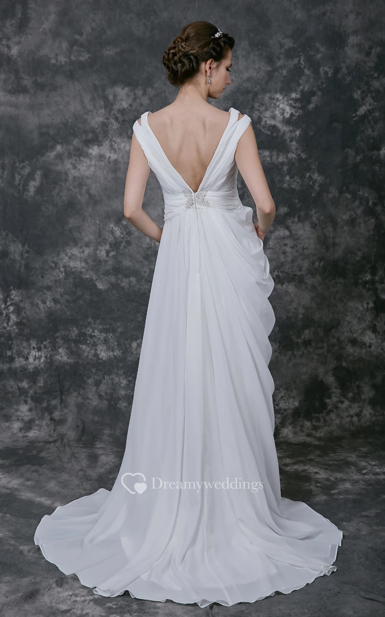 Take the spotlight in a dazzling white low slipover outfit. This open back outfit highlights shining beaded precious stones laying out the diving slipover bodice and waist. The sensational wrinkled itemizing on this long dress proceeds to the open back where the strappy plan fuses in a vogue look. This floor length low slipover dress has a full layered chiffon skirt that includes composition and a complimenting energy to the dress. Pair this chiffon outfit with fun gold adornments and your look will be fulfilled.