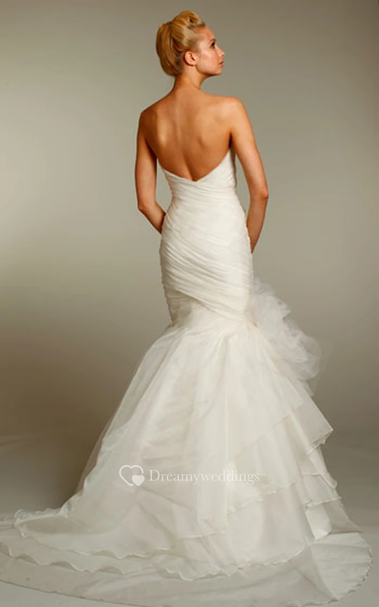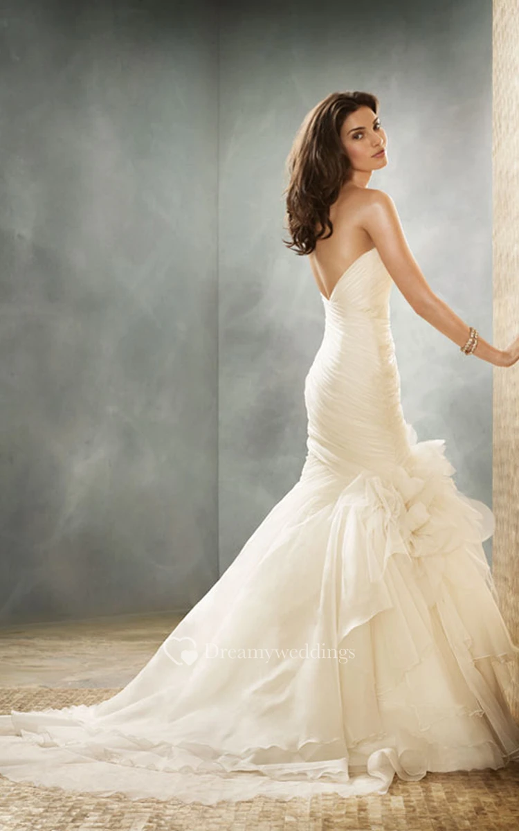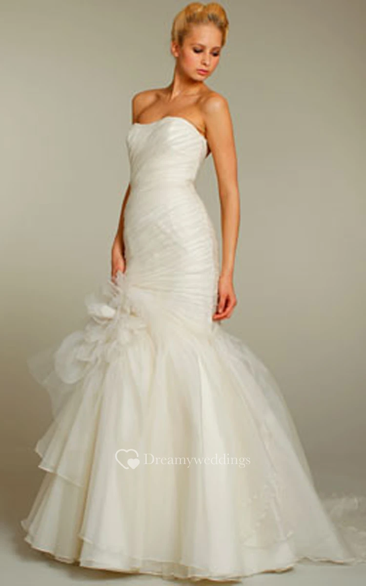Sassy Strapless Asymmetrical Draped Bodice Organza Tiered Dress With Floral Detail