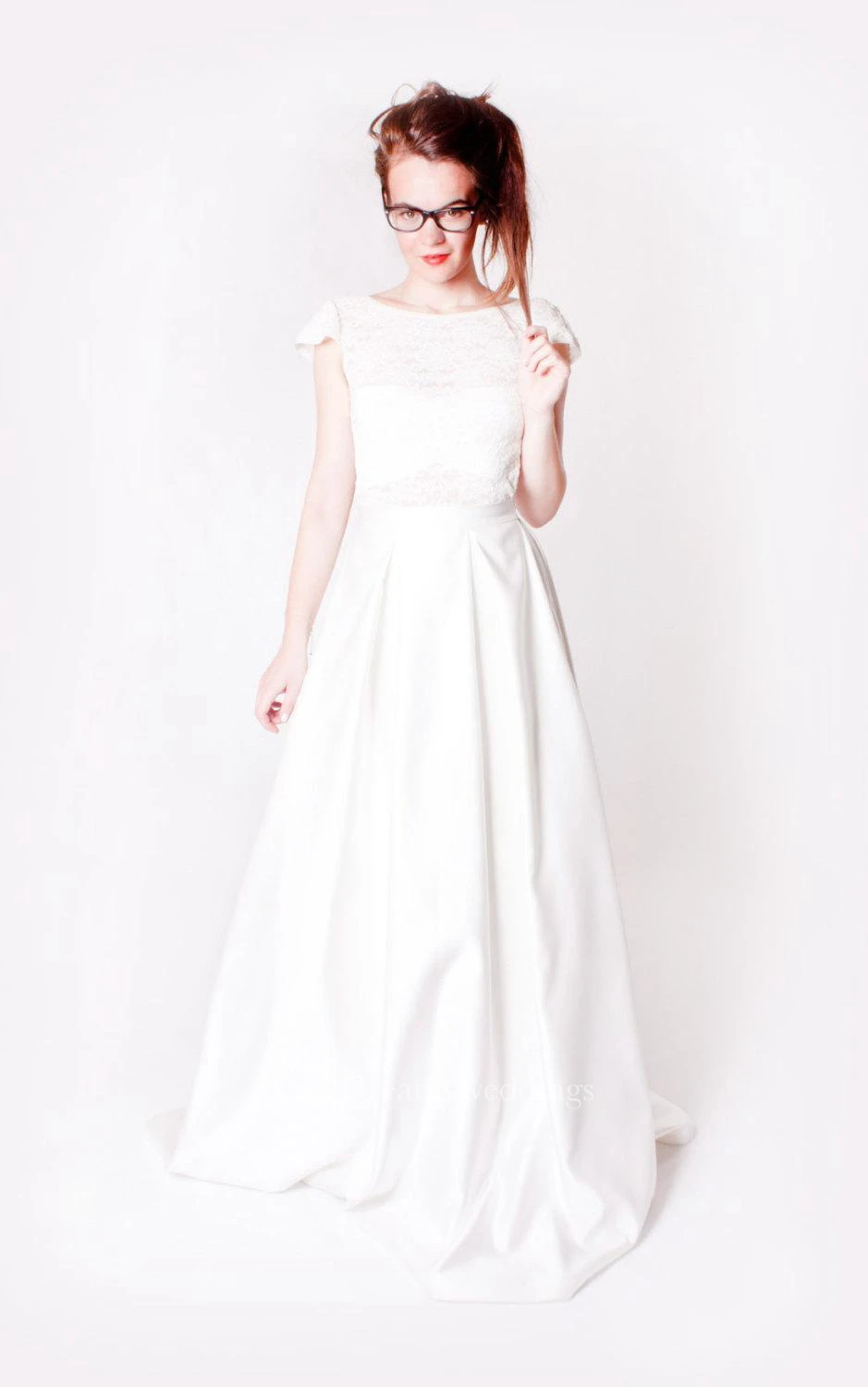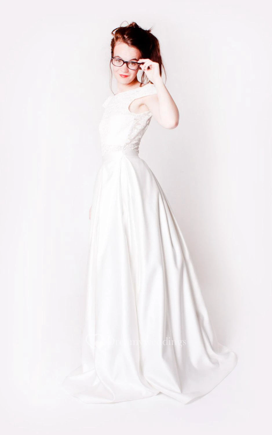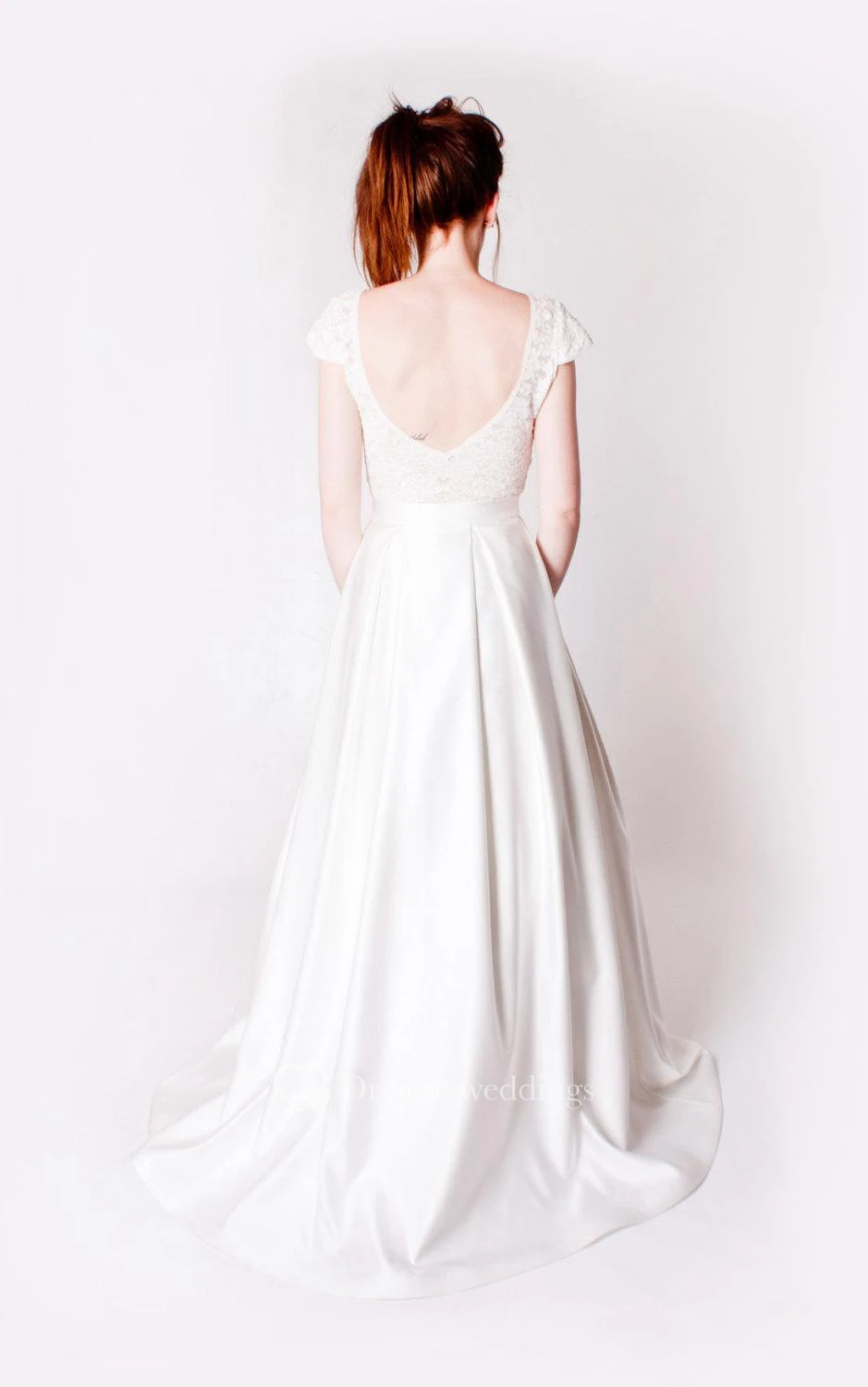 Satin Cap Sleeve A-Line Low-V Back Dress With Lace Bodice