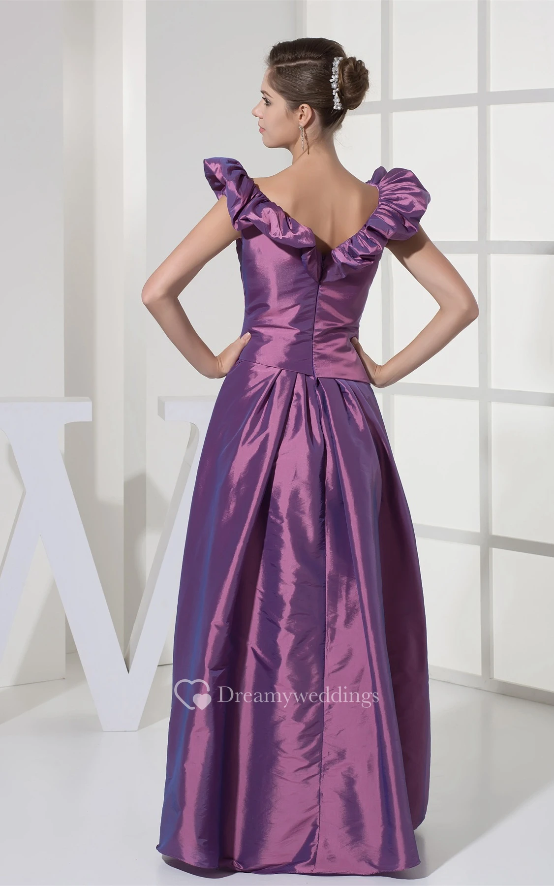 Satin Draped A-Line Gown With Ruffled V Neckline