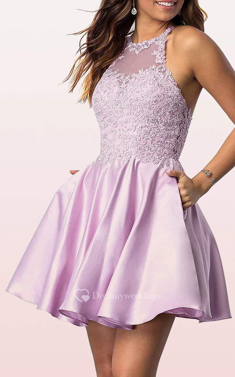 Satin Lace Mini A Line Sleeveless Simple Homecoming Dress with Appliques