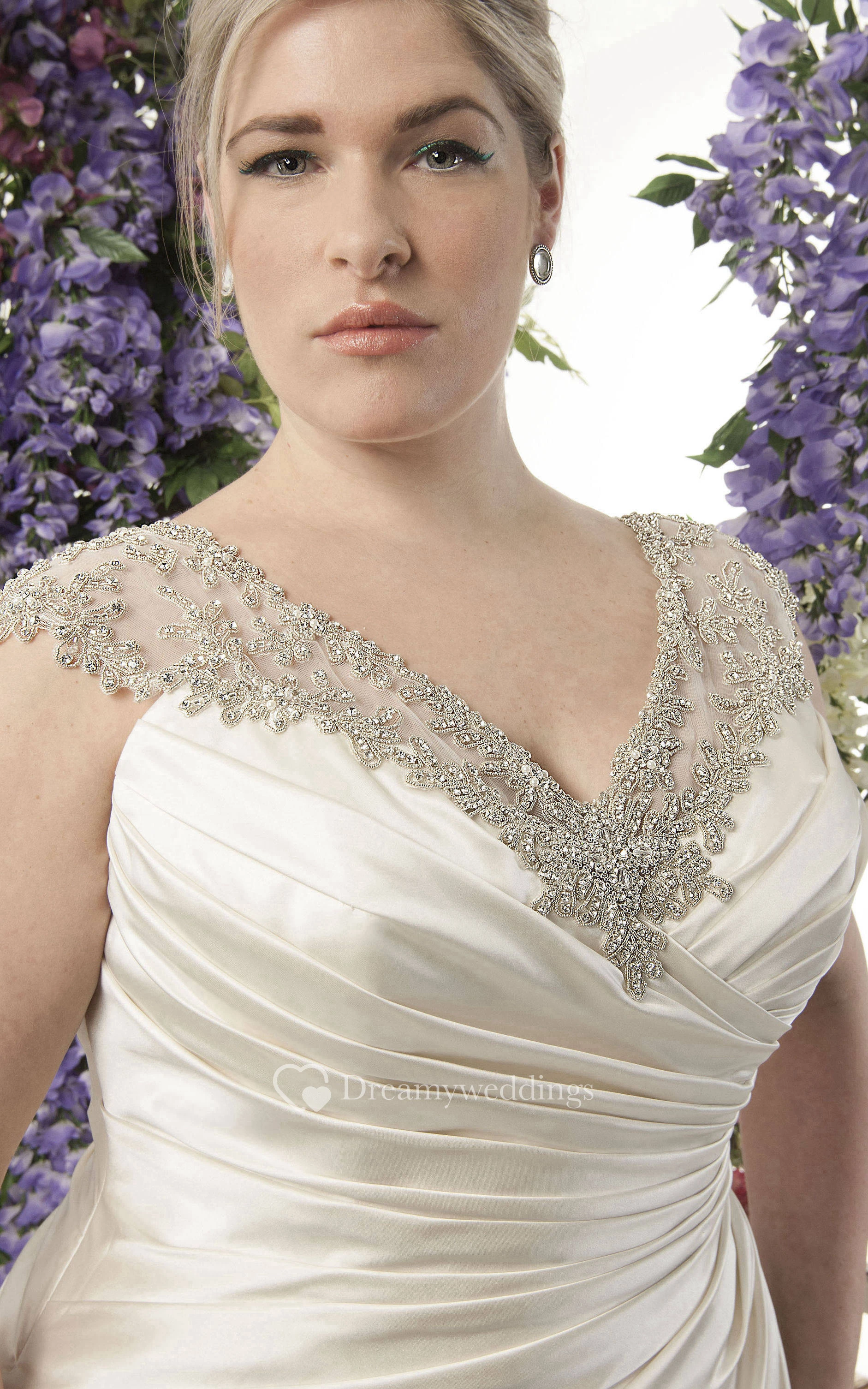 Satin Side-Ruched Caped-Sleeve Dress With Lace Illusion Back