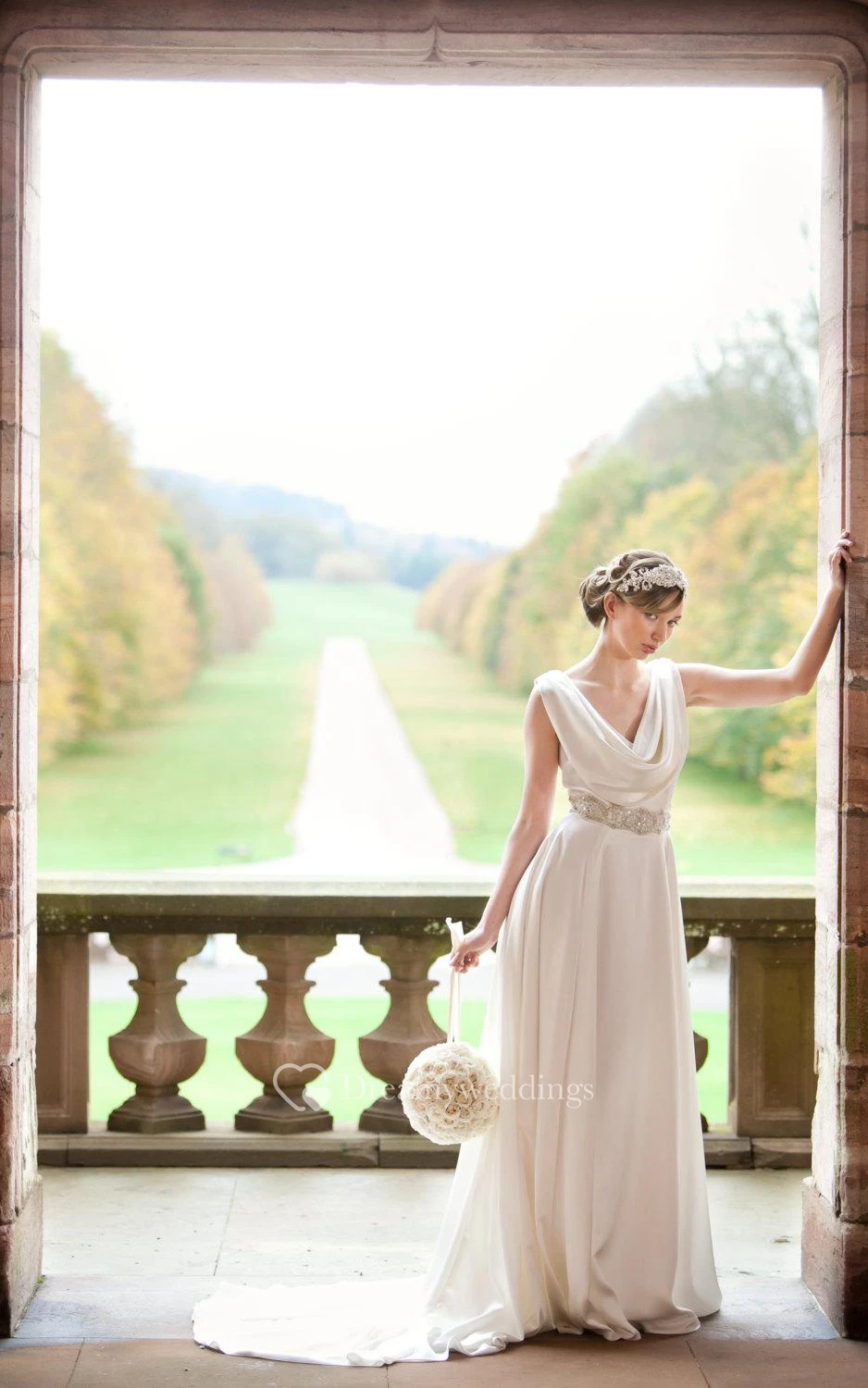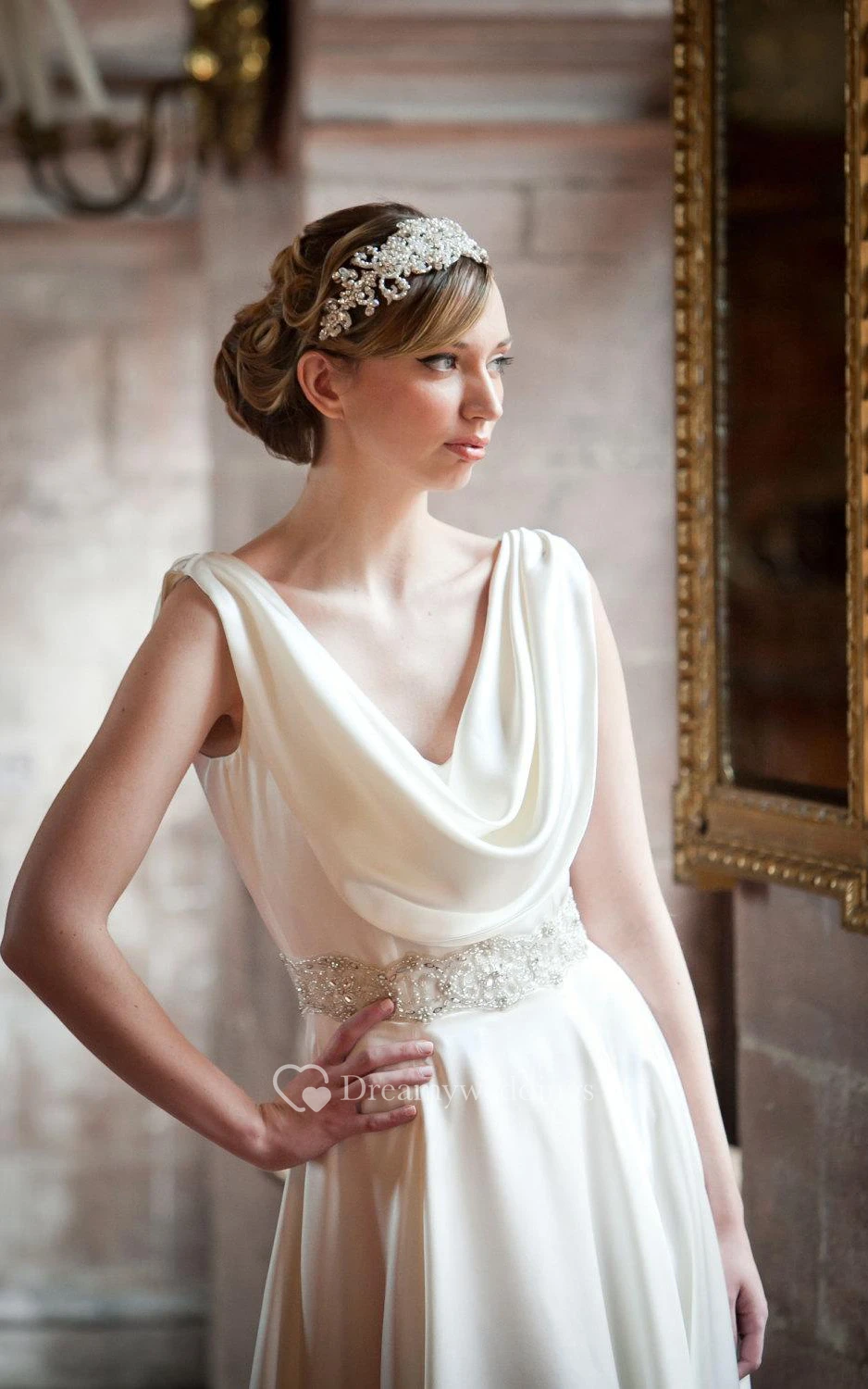 Satin Sleeveless A-Line Dress With Cowl Neck and Beaded Waistbelt