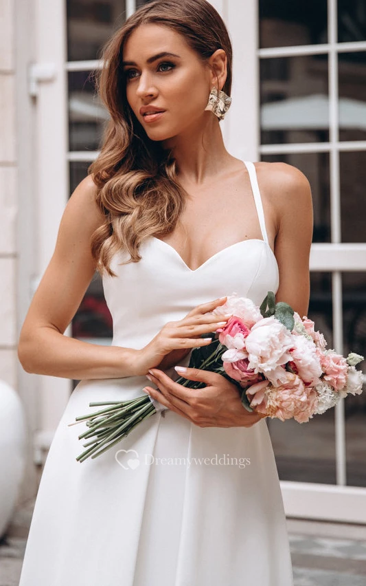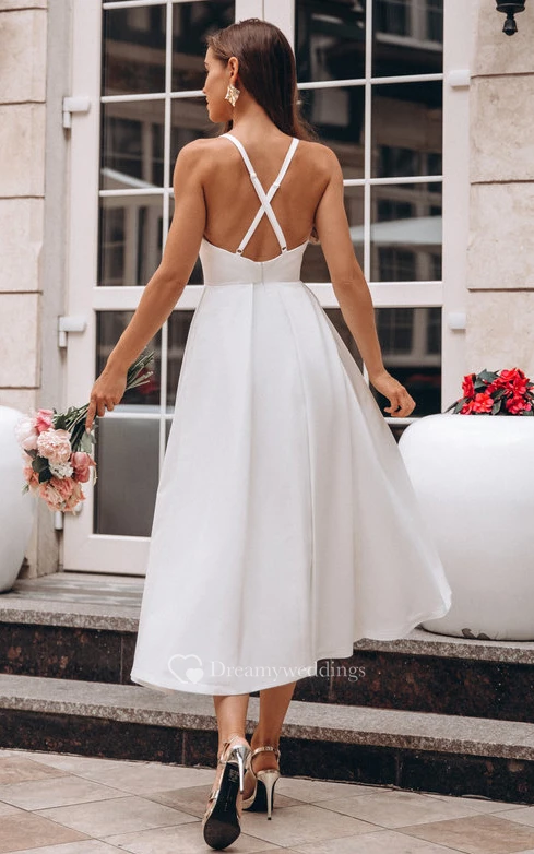 Satin Tea-length A Line Sleeveless Simple Wedding Dress with Ruffles