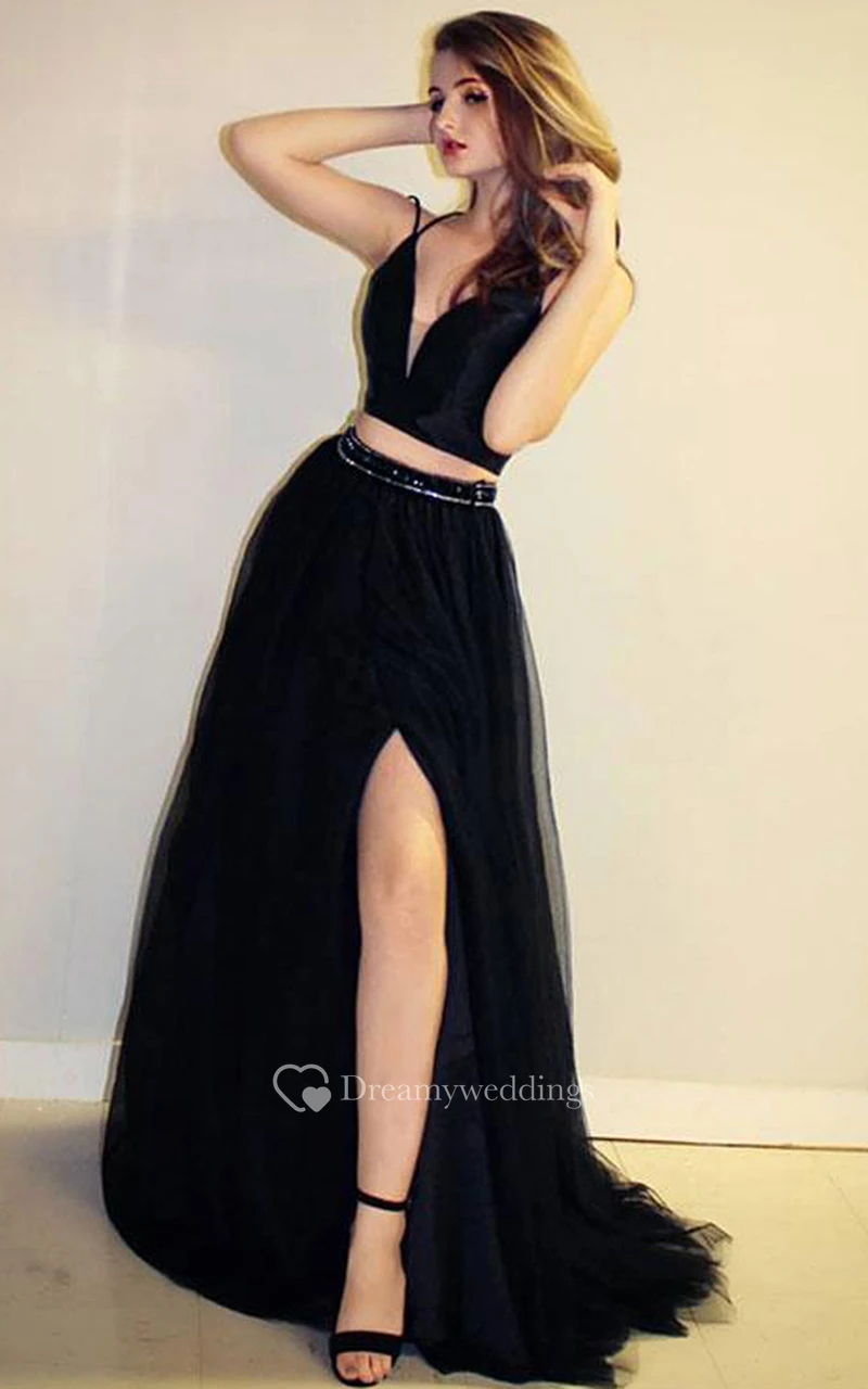Satin Tulle Floor-length Sweep Train Two Piece Sleeveless Informal Evening Dress