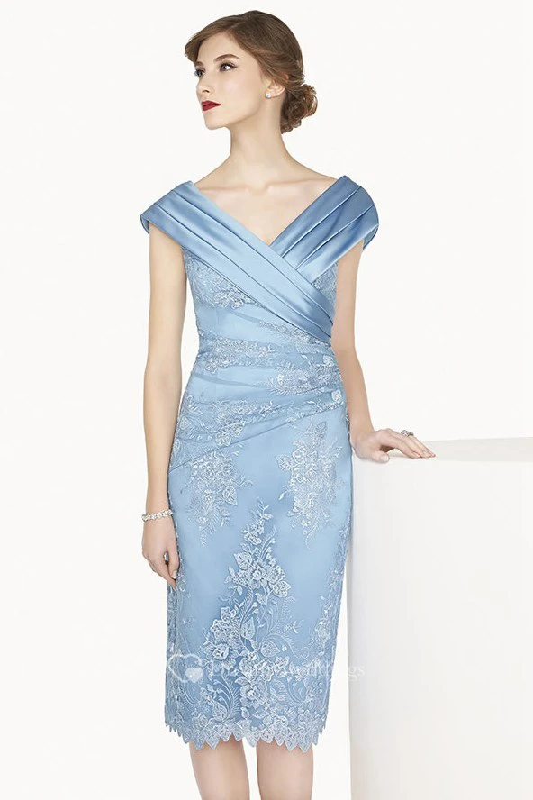 Satin V Neck Cap Sleeve Sheath Knee Length Lace Prom Dress Shown In Blue