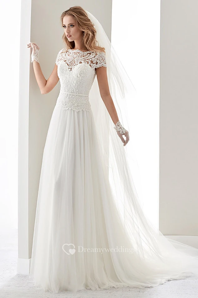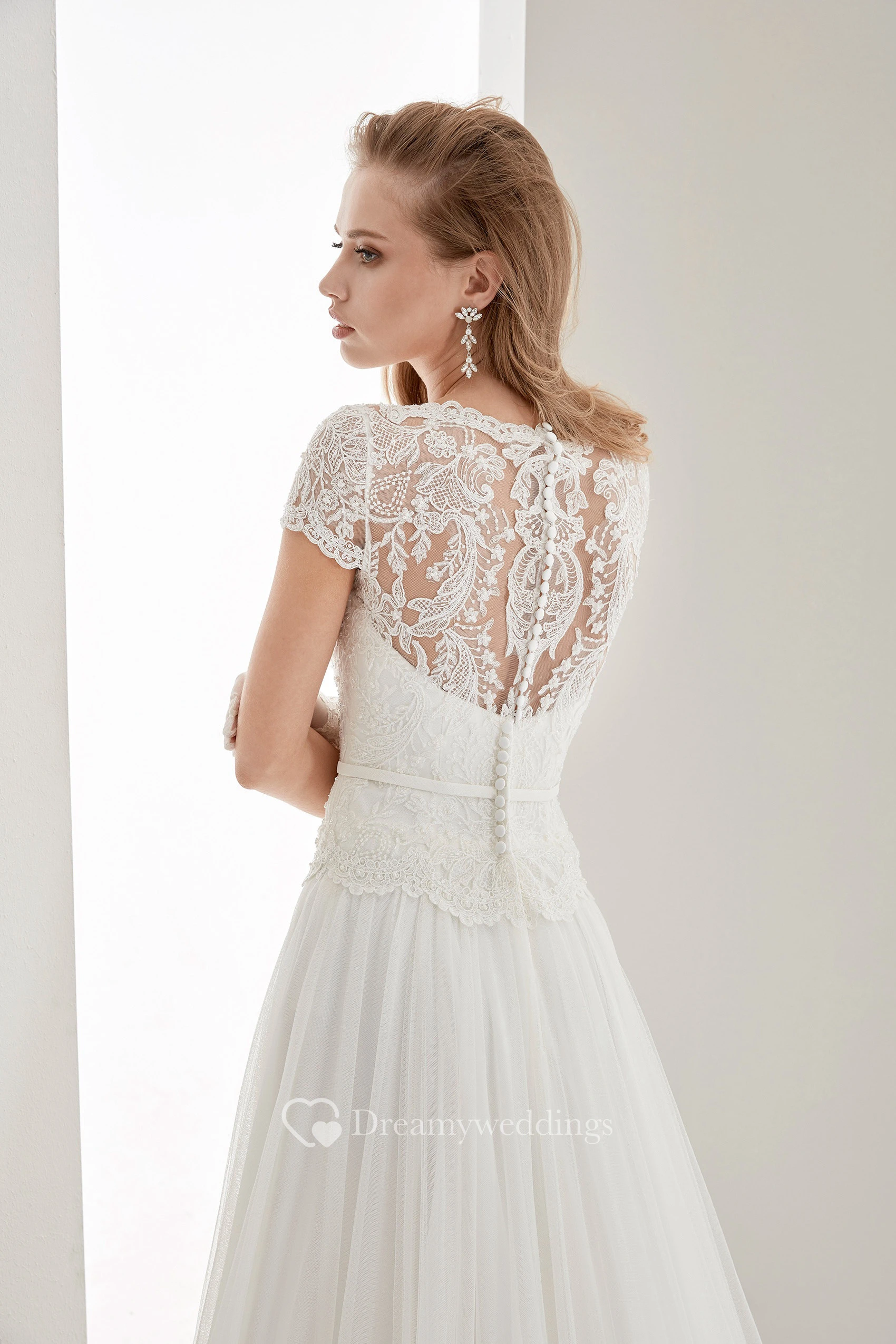 Scalloped-Neck Illusion Draping Wedding Dress With Lace Bodice And T-Shirt Sleeves