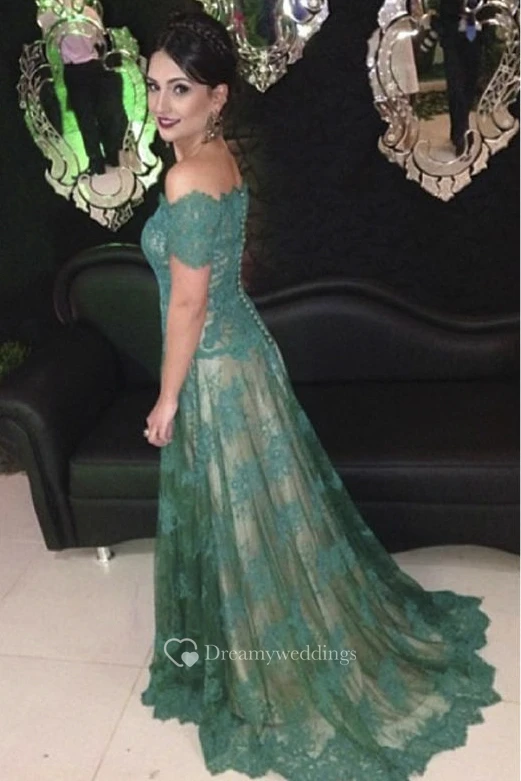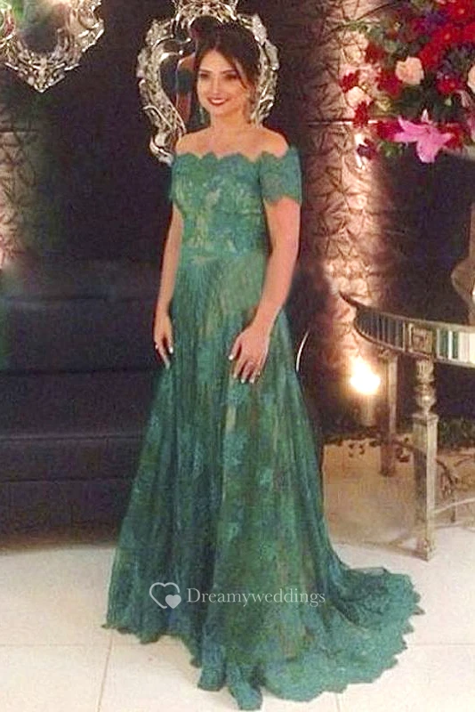 Scalloped Off-the-shoulder A-line Lace Long Dress With Short Sleeve