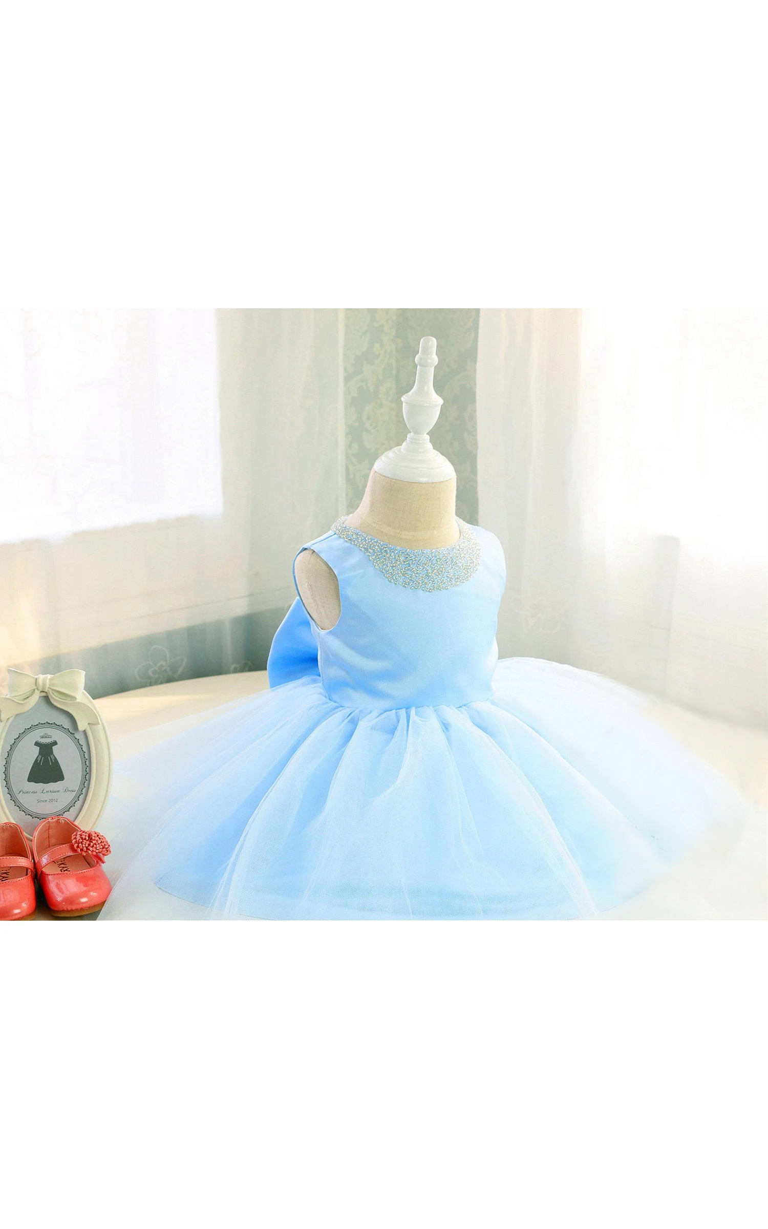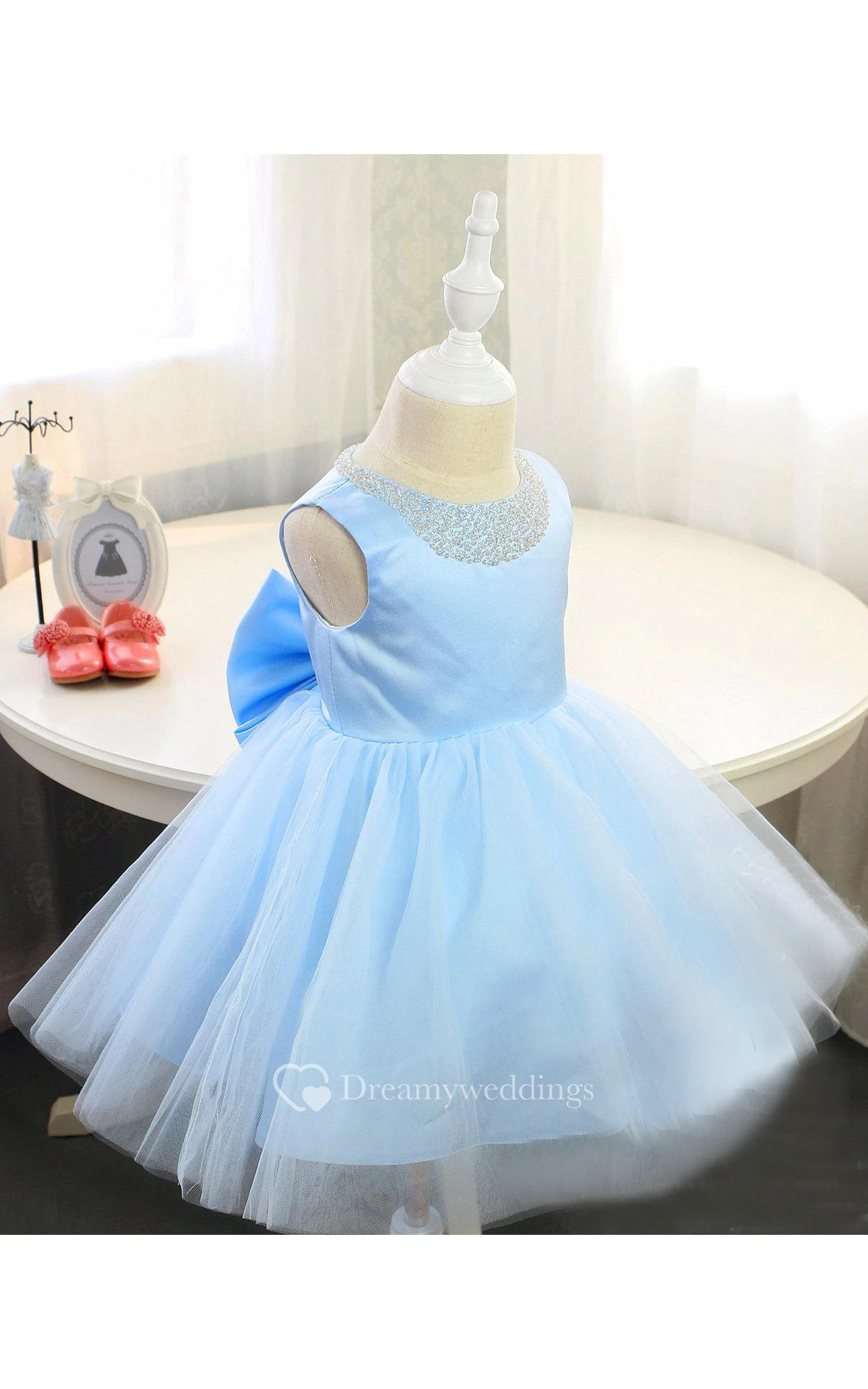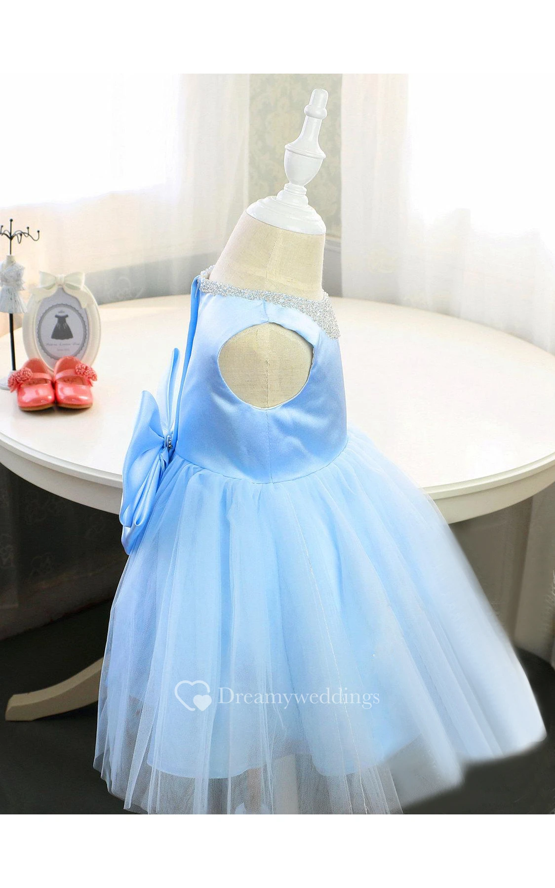 Scoop Beading Neck Sleeveless A-line Knee Length Pleated Tulle Dress With Bow