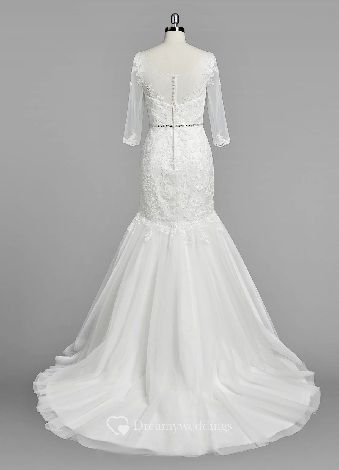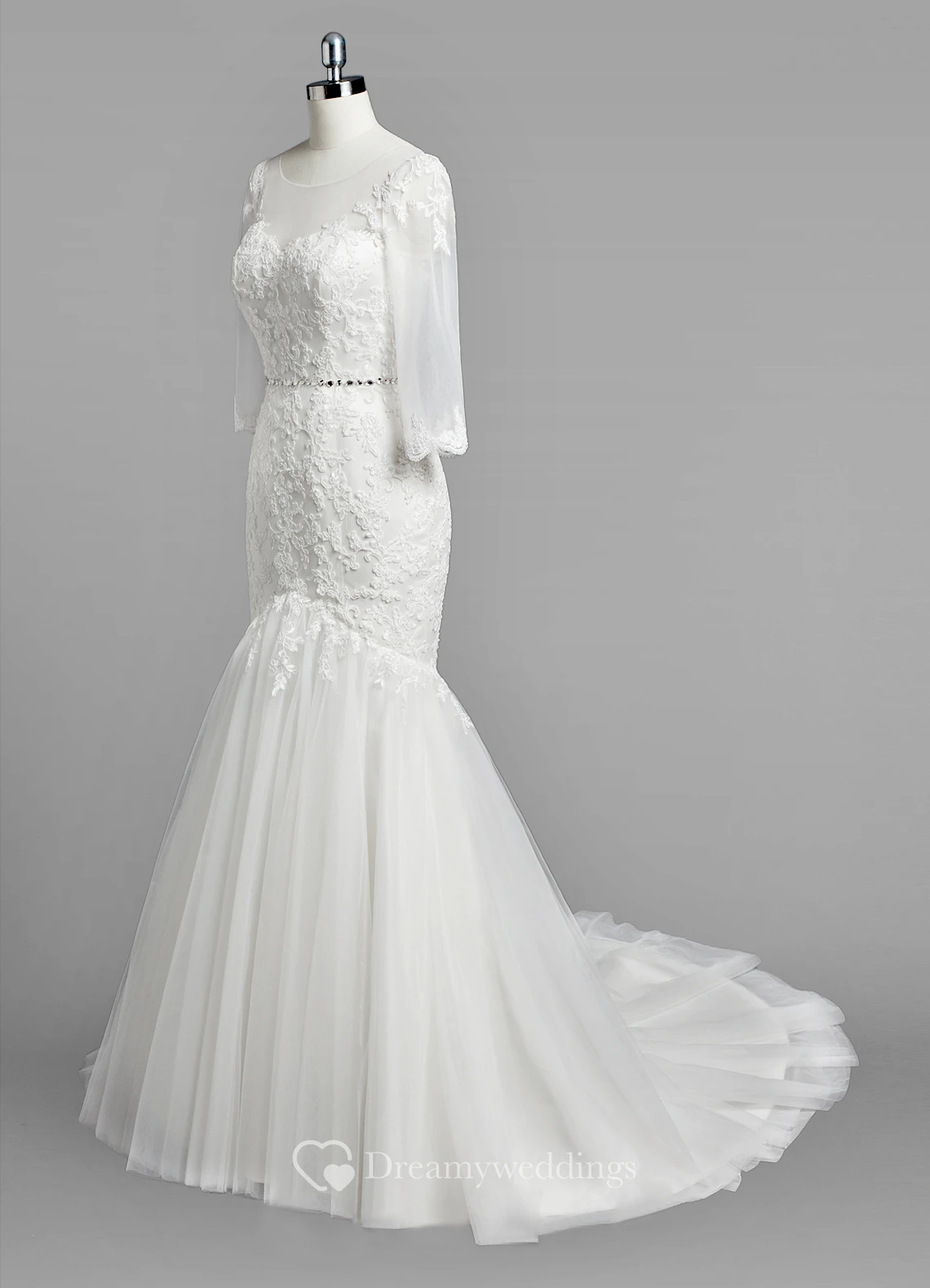 Scoop Neck 3-4 Sleeve Mermaid Lace and Tulle Wedding Dress With Beading