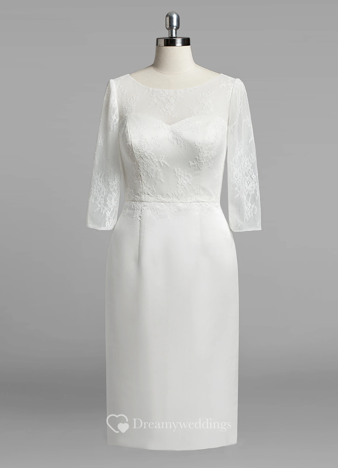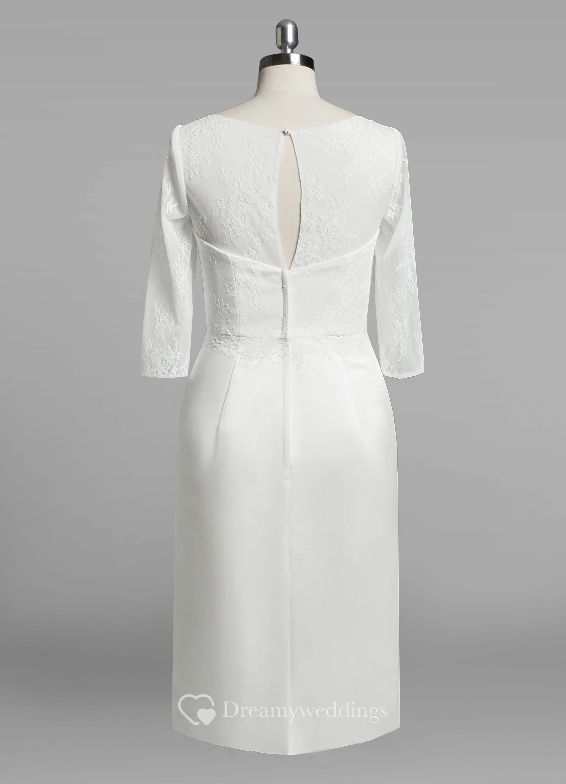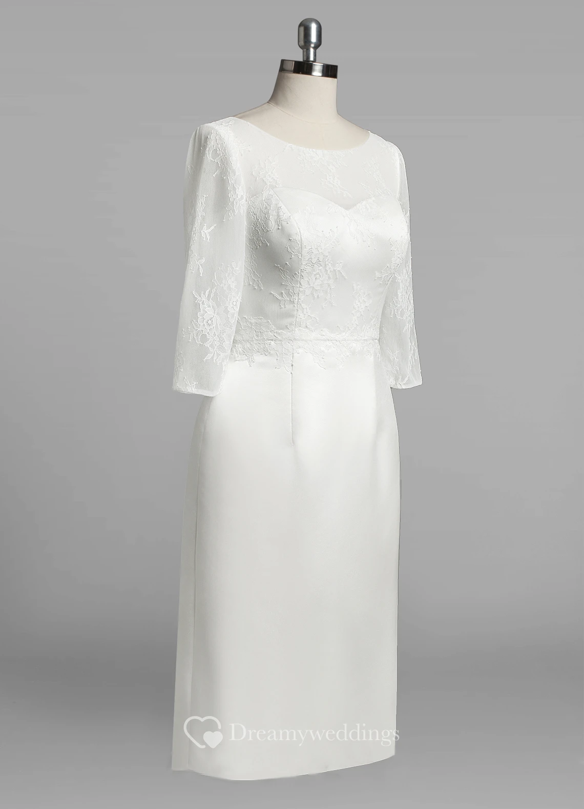 Scoop Neck 3-4 Sleeve Sheath Satin Wedding Dress With Lace Bodice