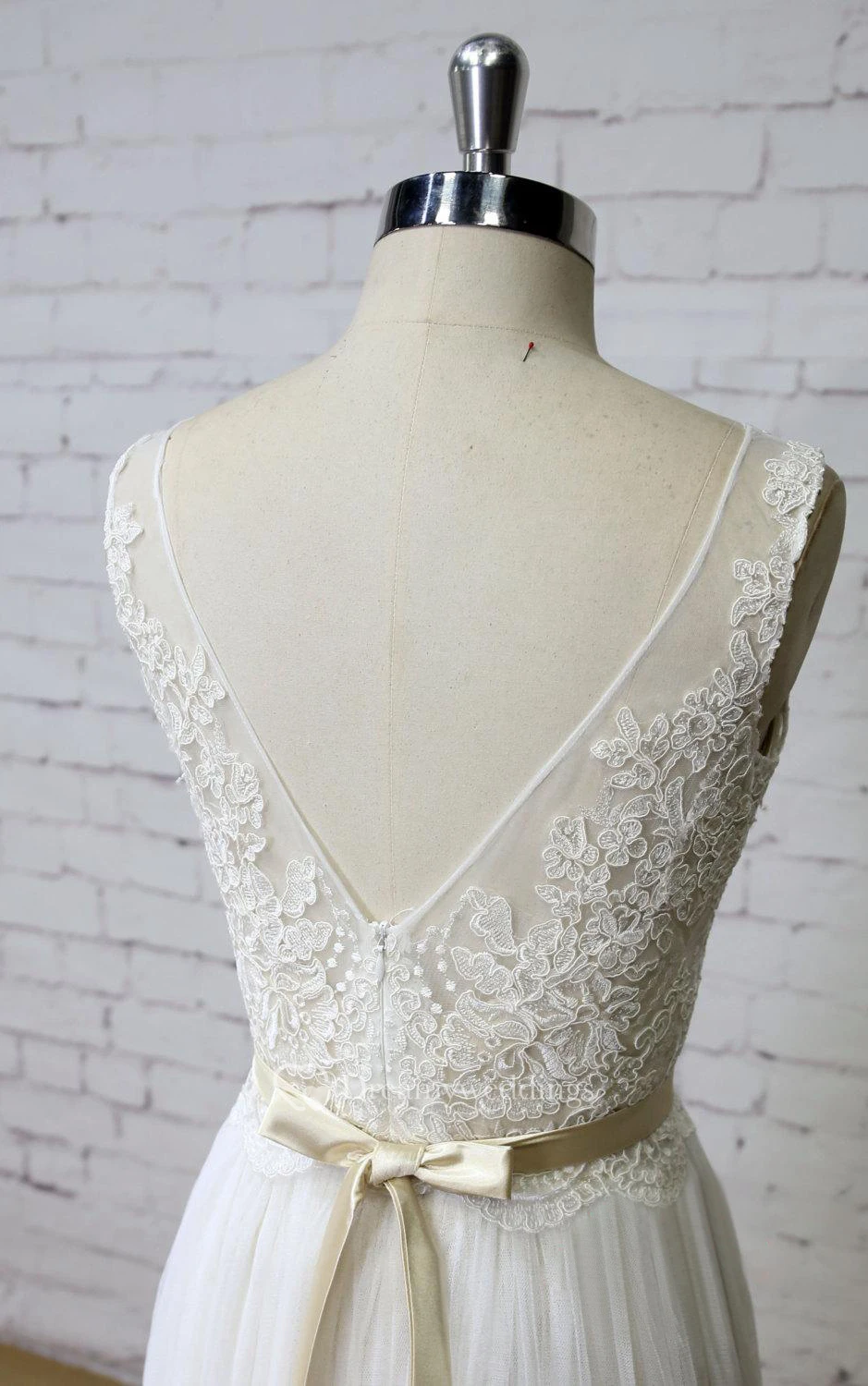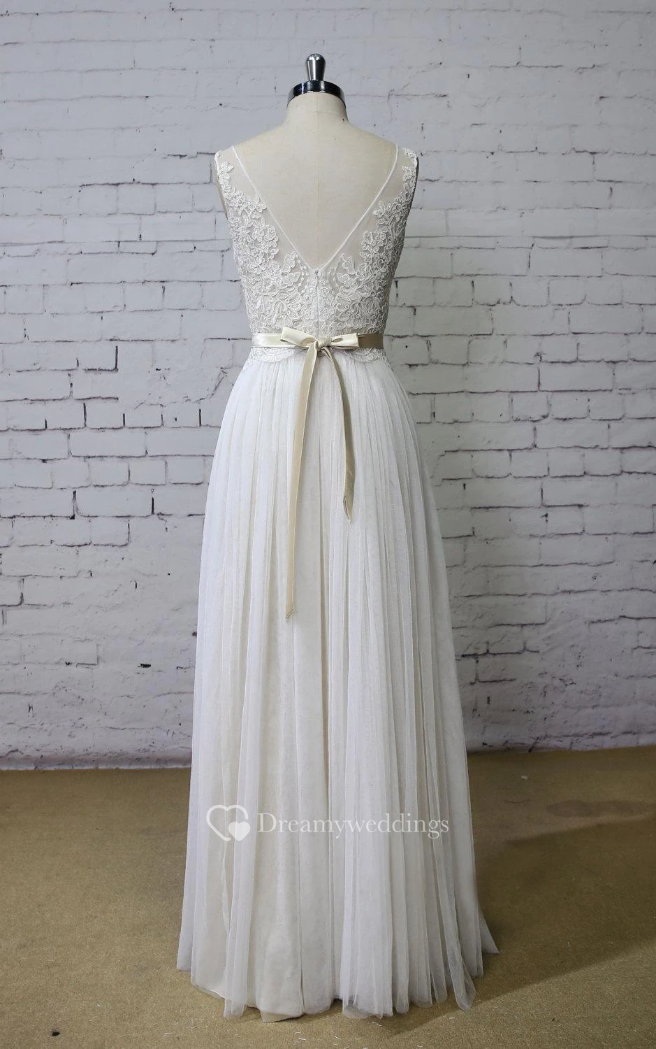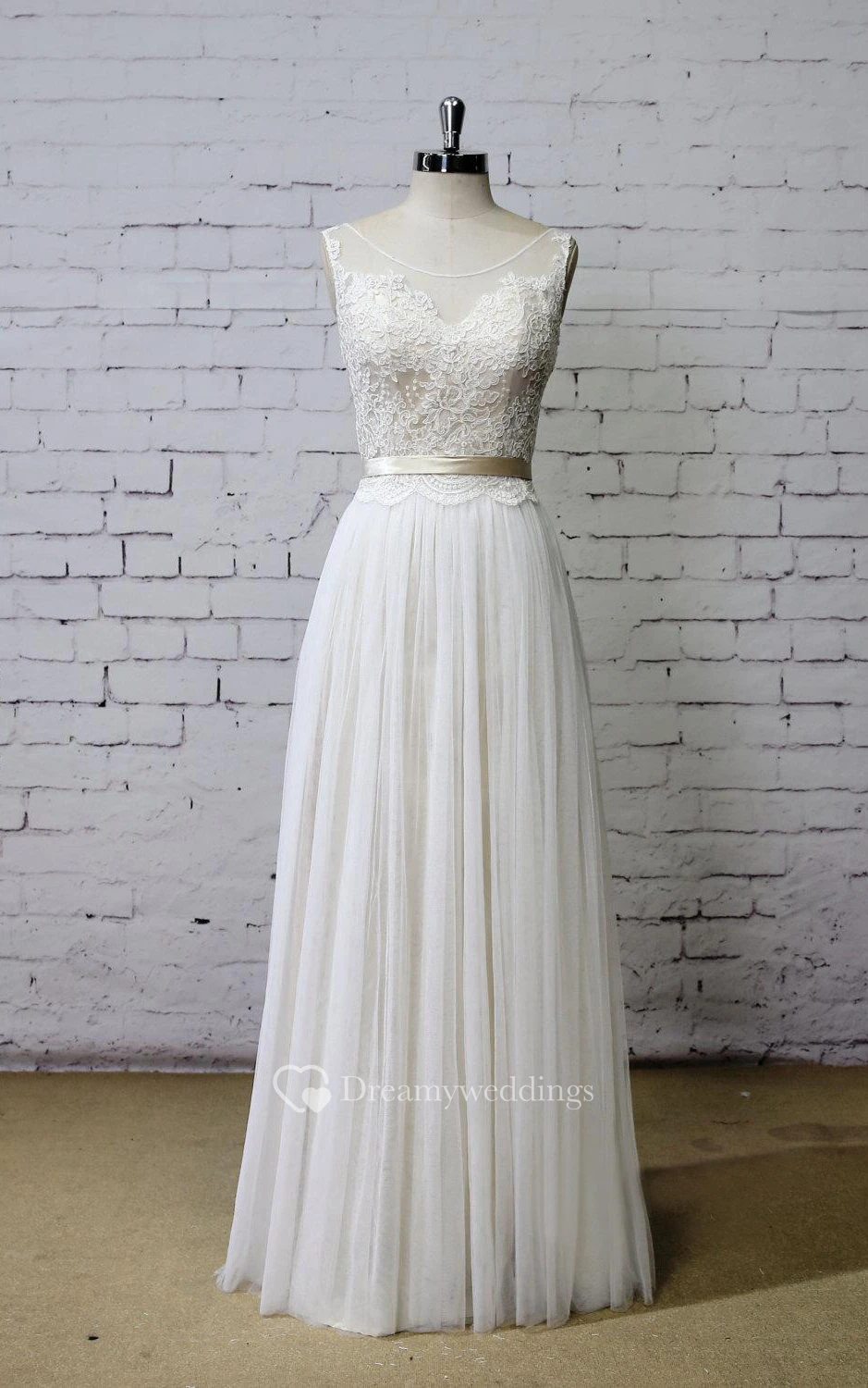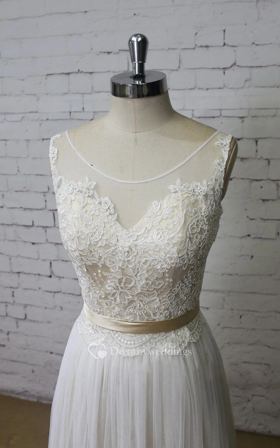 Scoop Neck A-Line Tulle and Lace Dress With Pleats and Satin Sash