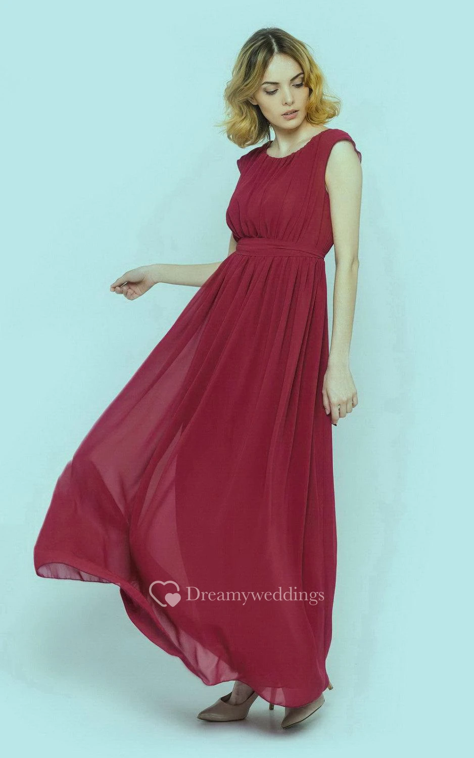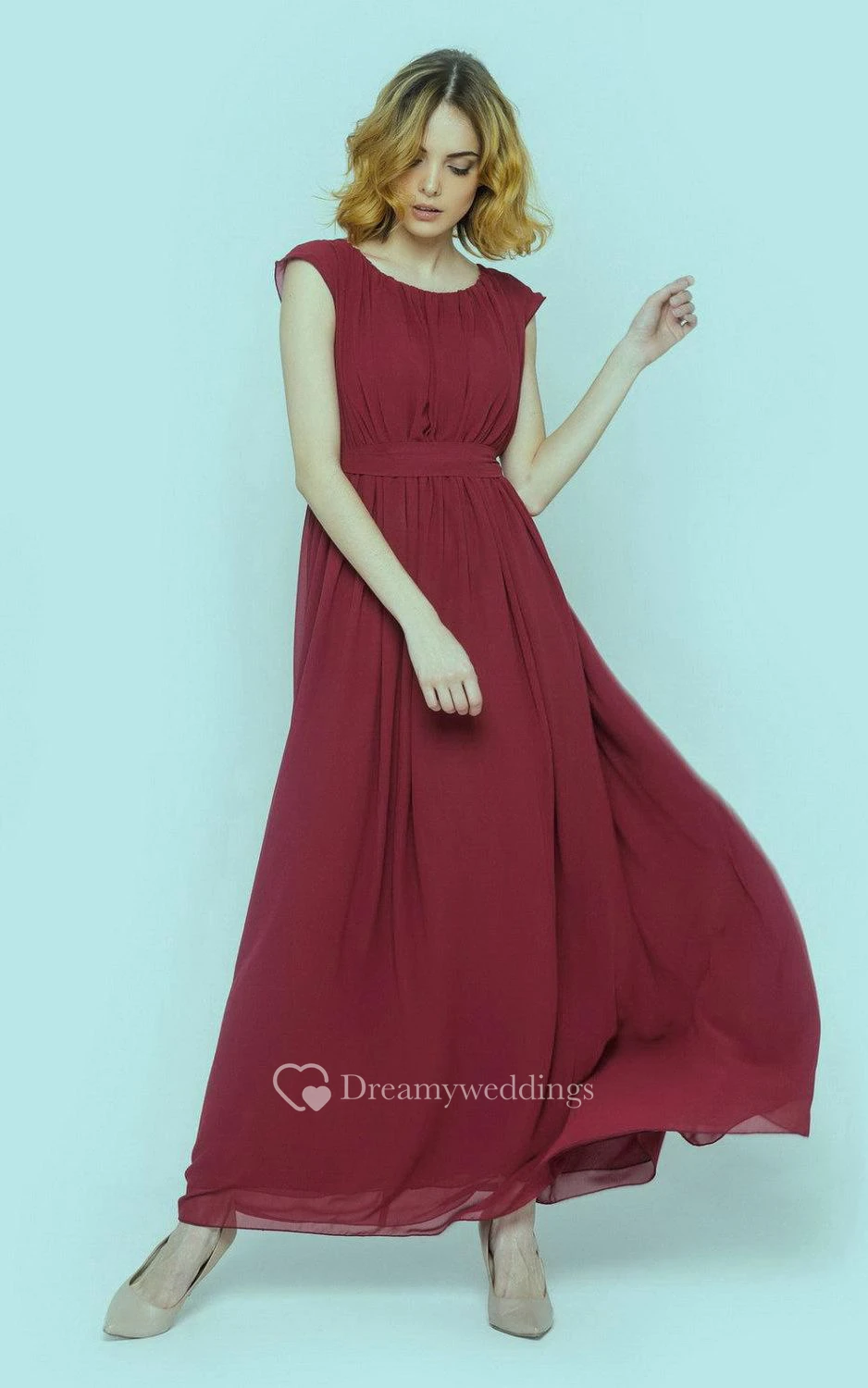 Scoop Neck Cap Sleeve Empire A-line Chiffon Long Dress With Pleats