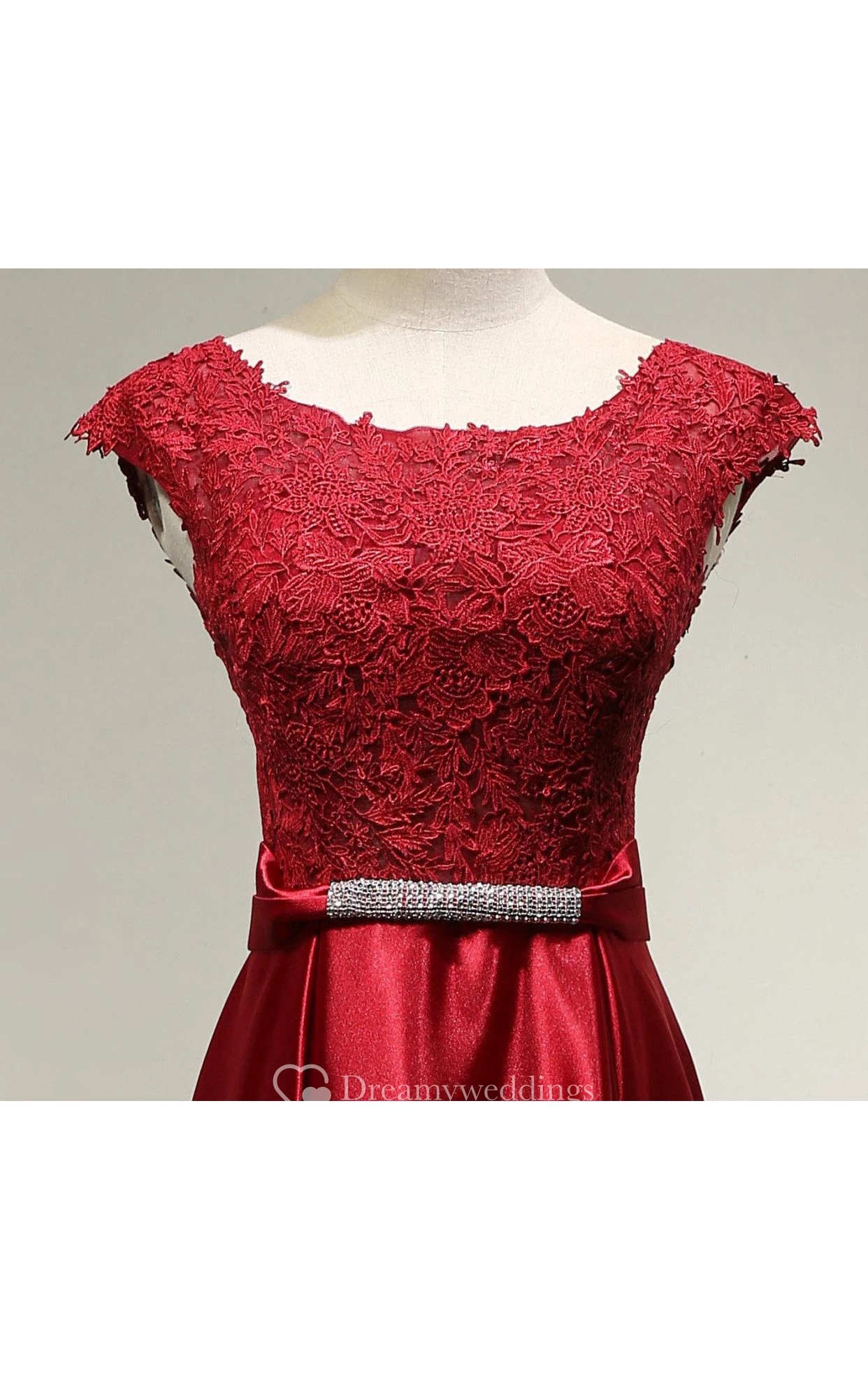 Scoop Neck Cap Sleeve Lace Bodice Satin A-line Long Dress With U Back