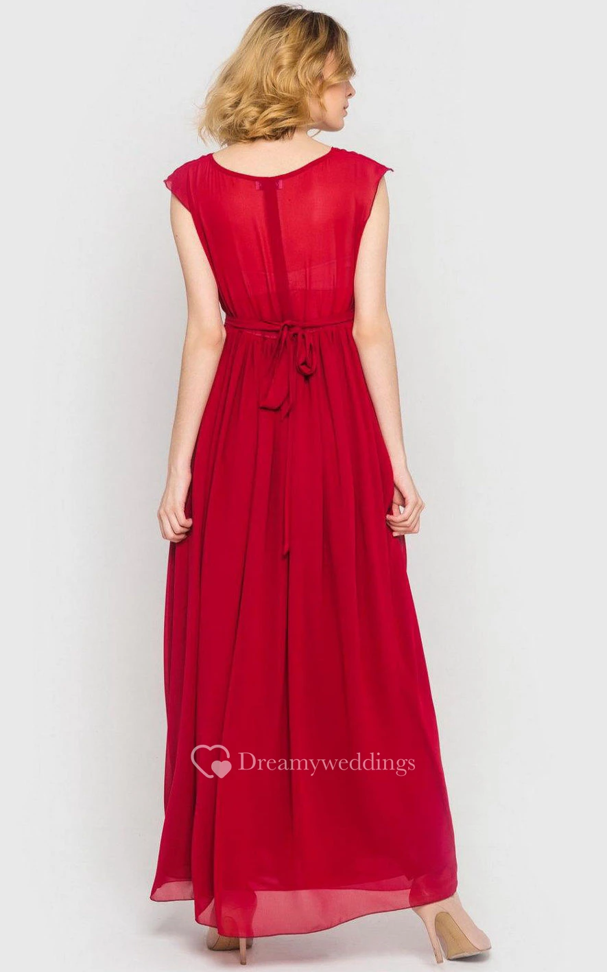 Scoop Neck Cap Sleeve Pleated A-line Chiffon Ankle Length Dress Red
