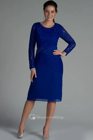 Scoop Neck Lace Long Sleeve Chiffon Knee Length Mother Of The Bride Dress With Beadings