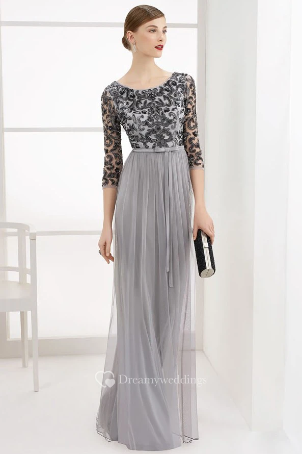 Scoop Neck Open Square Back Tulle Long Prom Dress With Beaded Bodice