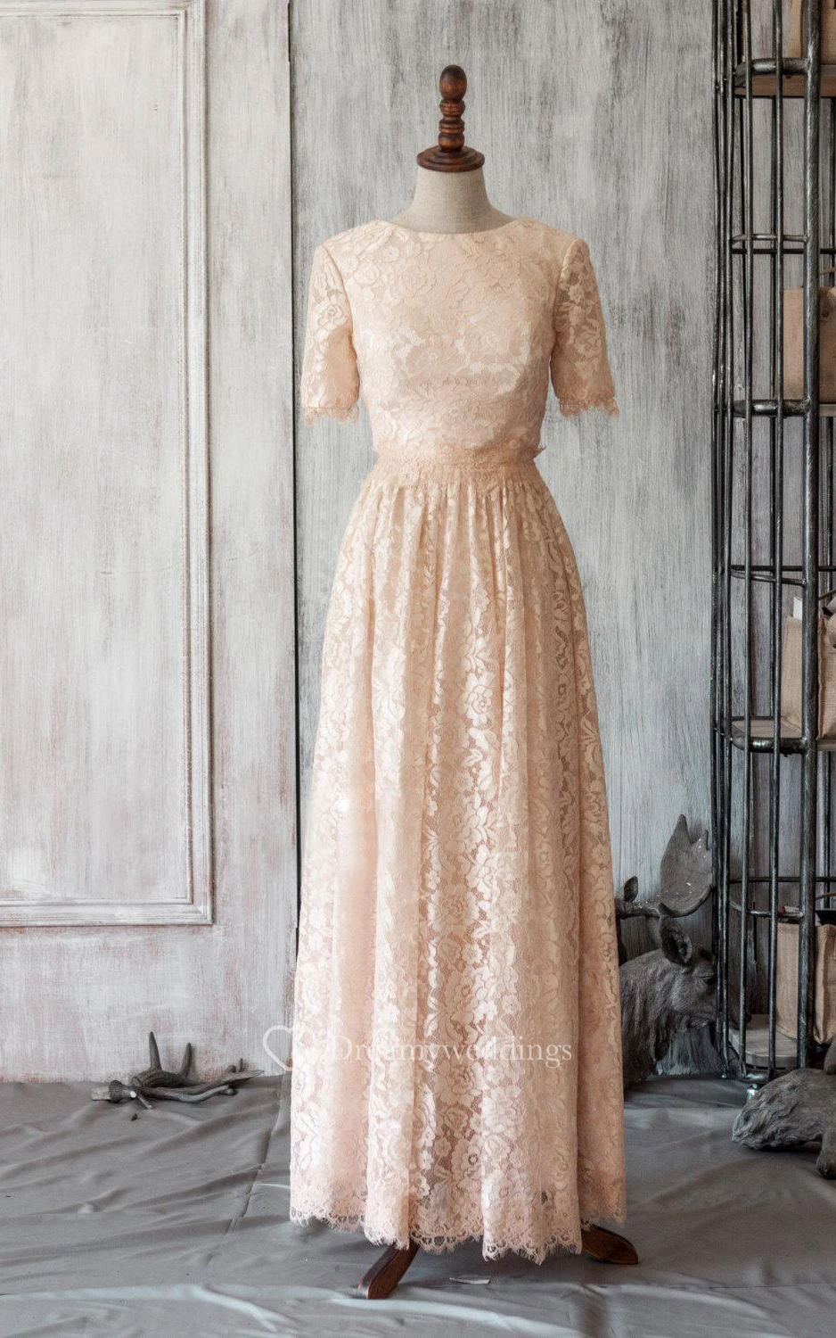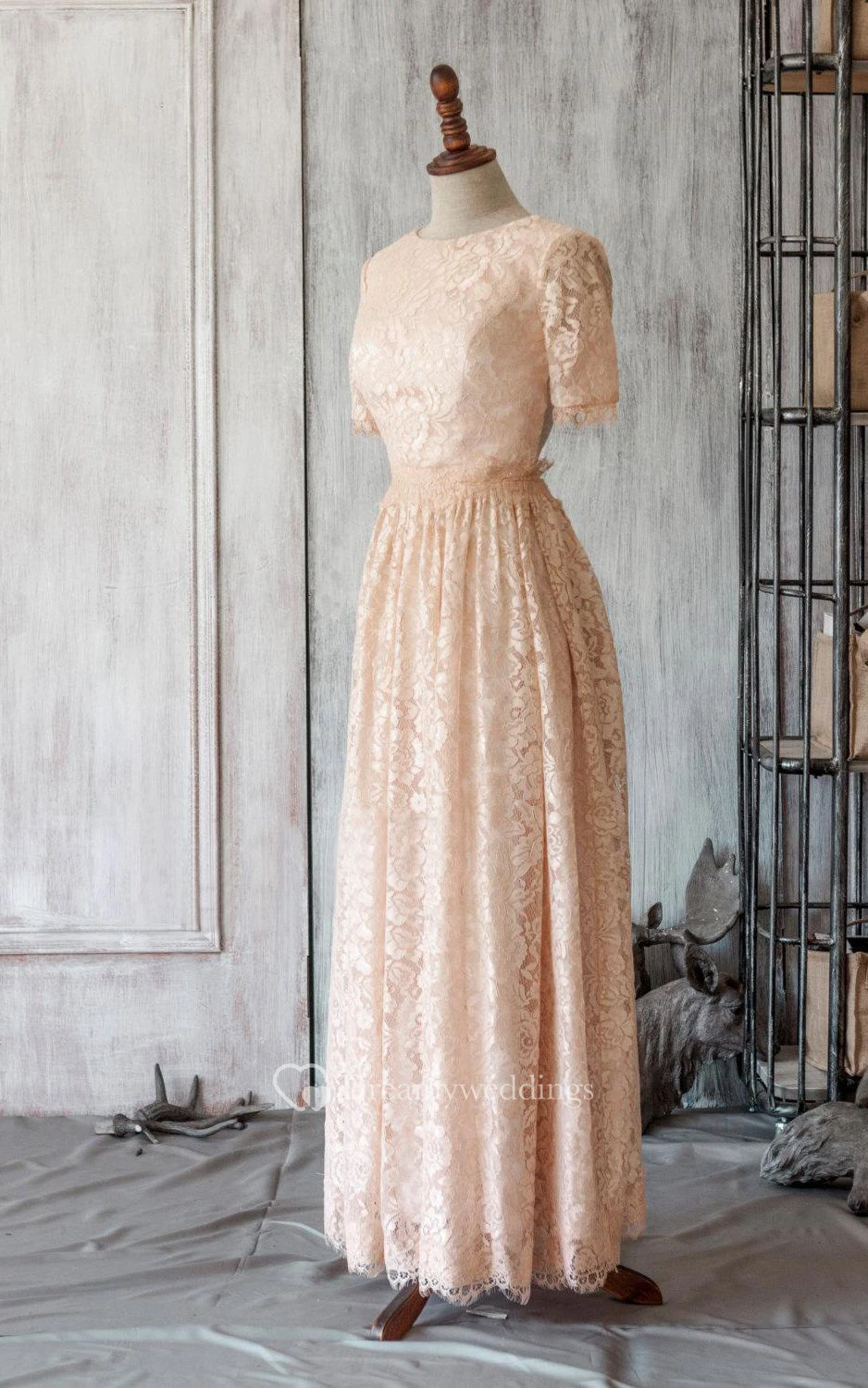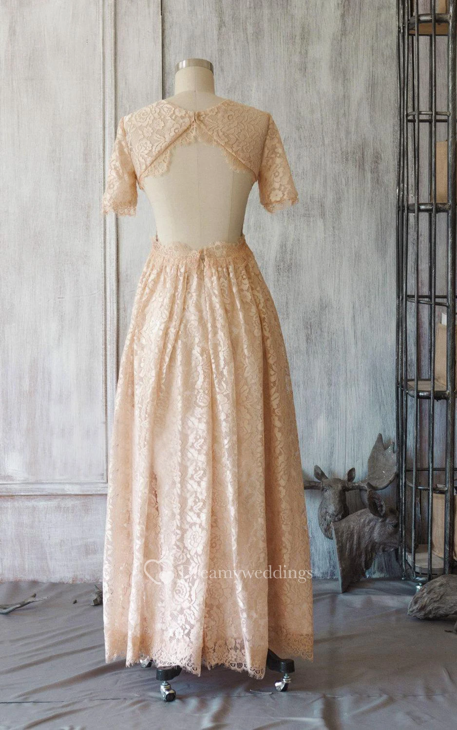 Scoop Neck Short Sleeve Allover Lace A-line Pleated Long Dress With Keyhole