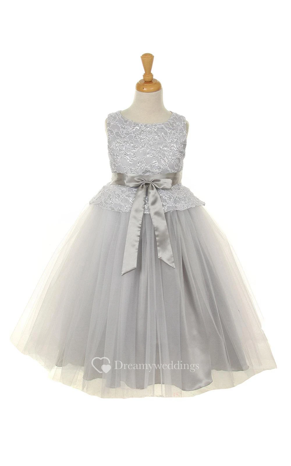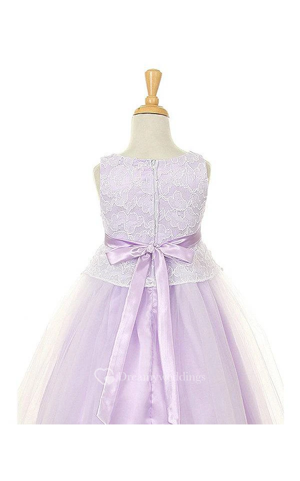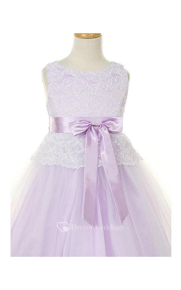 Scoop Neck Sleeveless Lace Tulle Ball Gown With Satin Sash