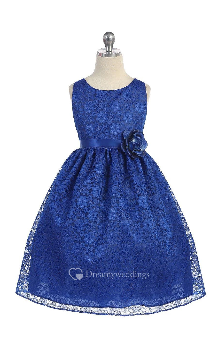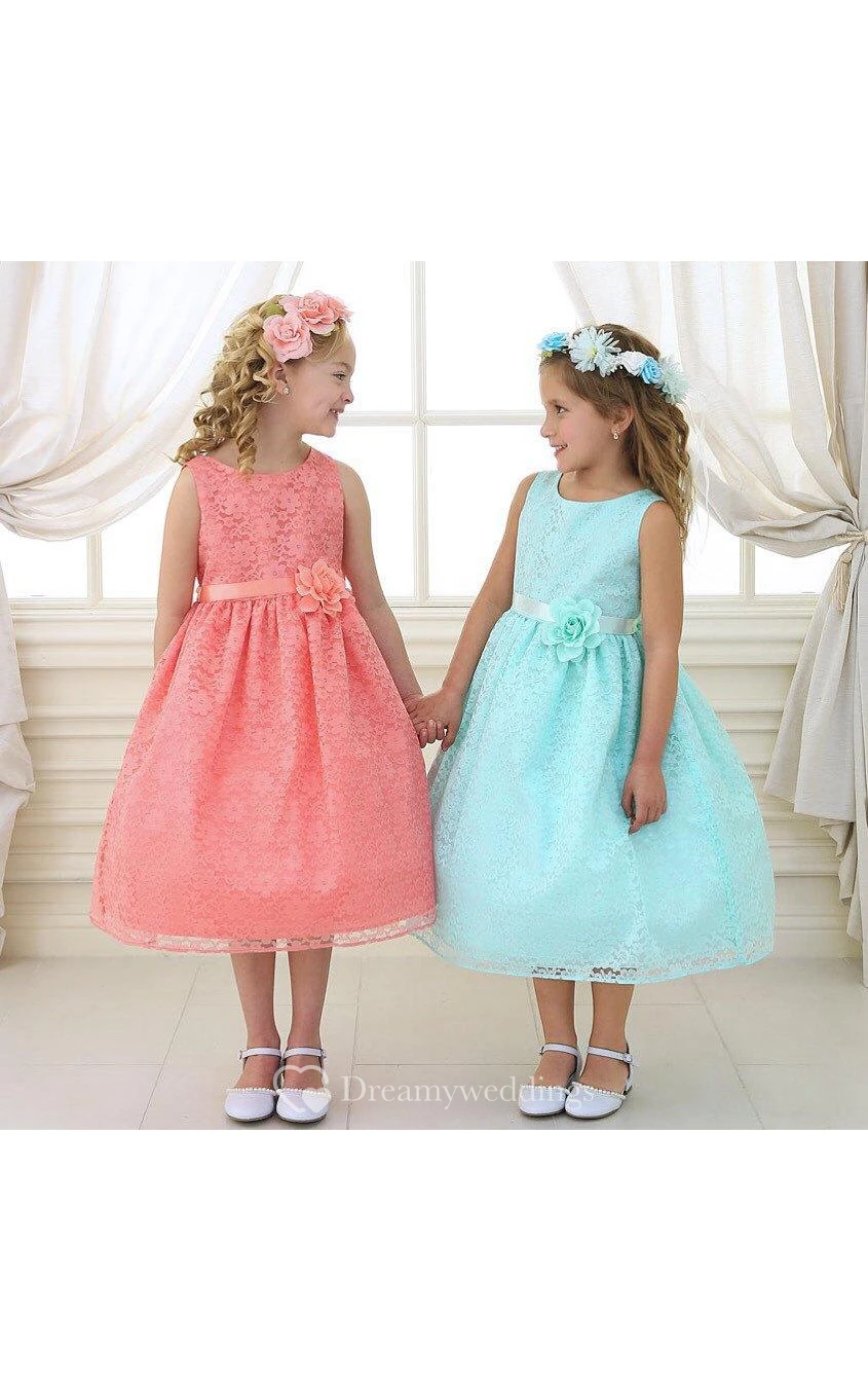 Scoop Neck Sleeveless Pleated Allover Lace Ball Gown With Flower Sash
