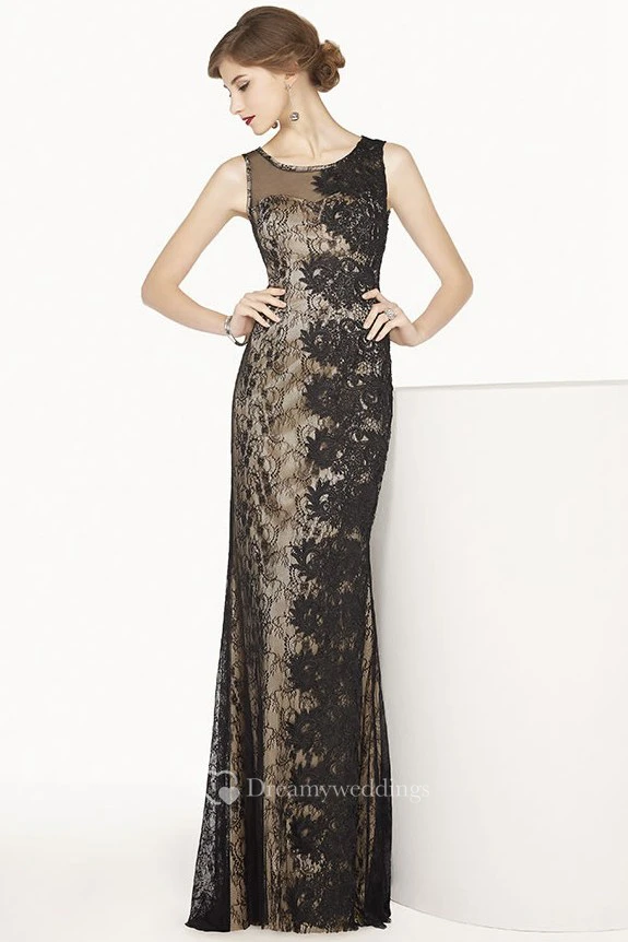 Scoop Neck Sleeveless Sheath Lace Long Prom Dress Illusion Style