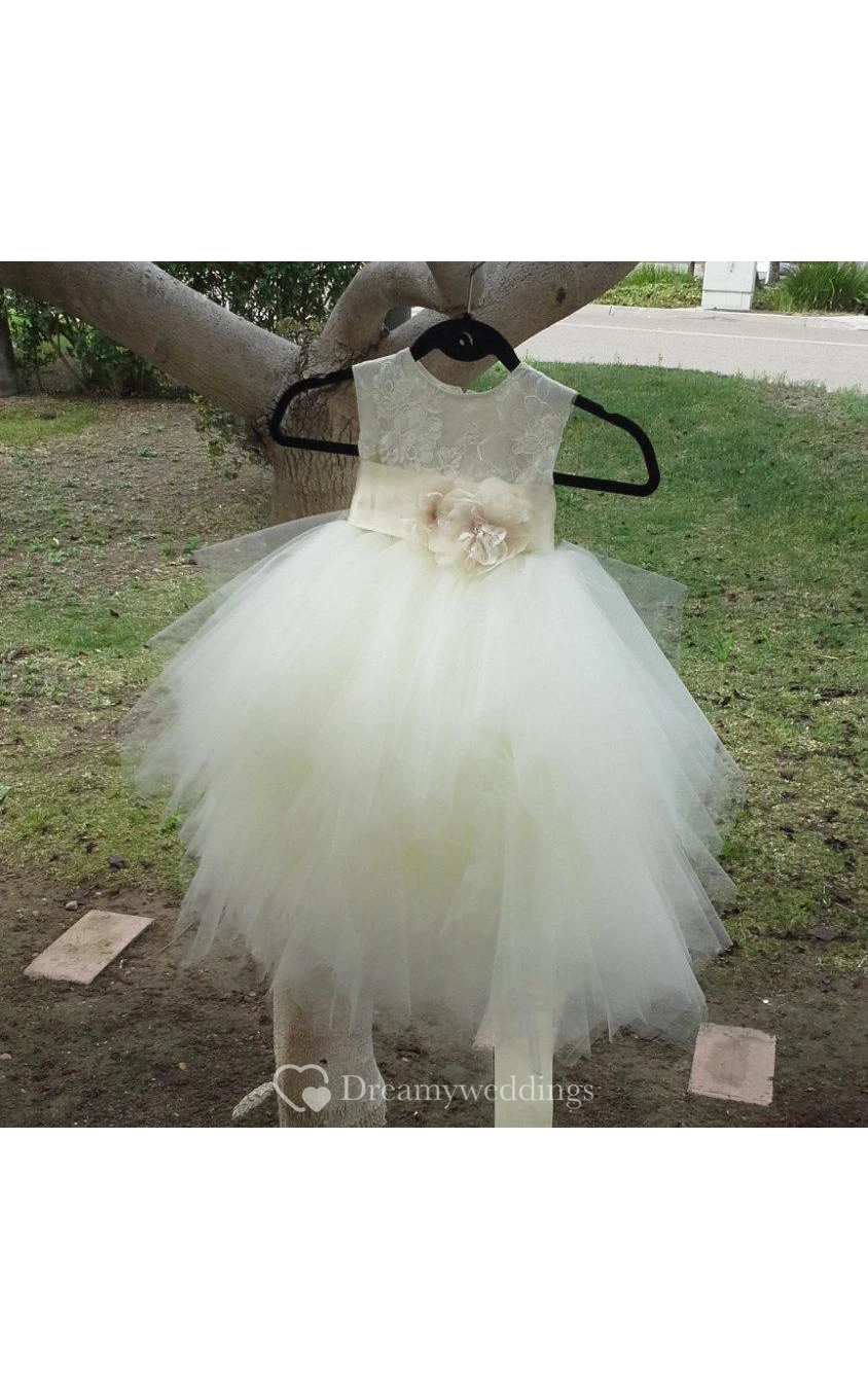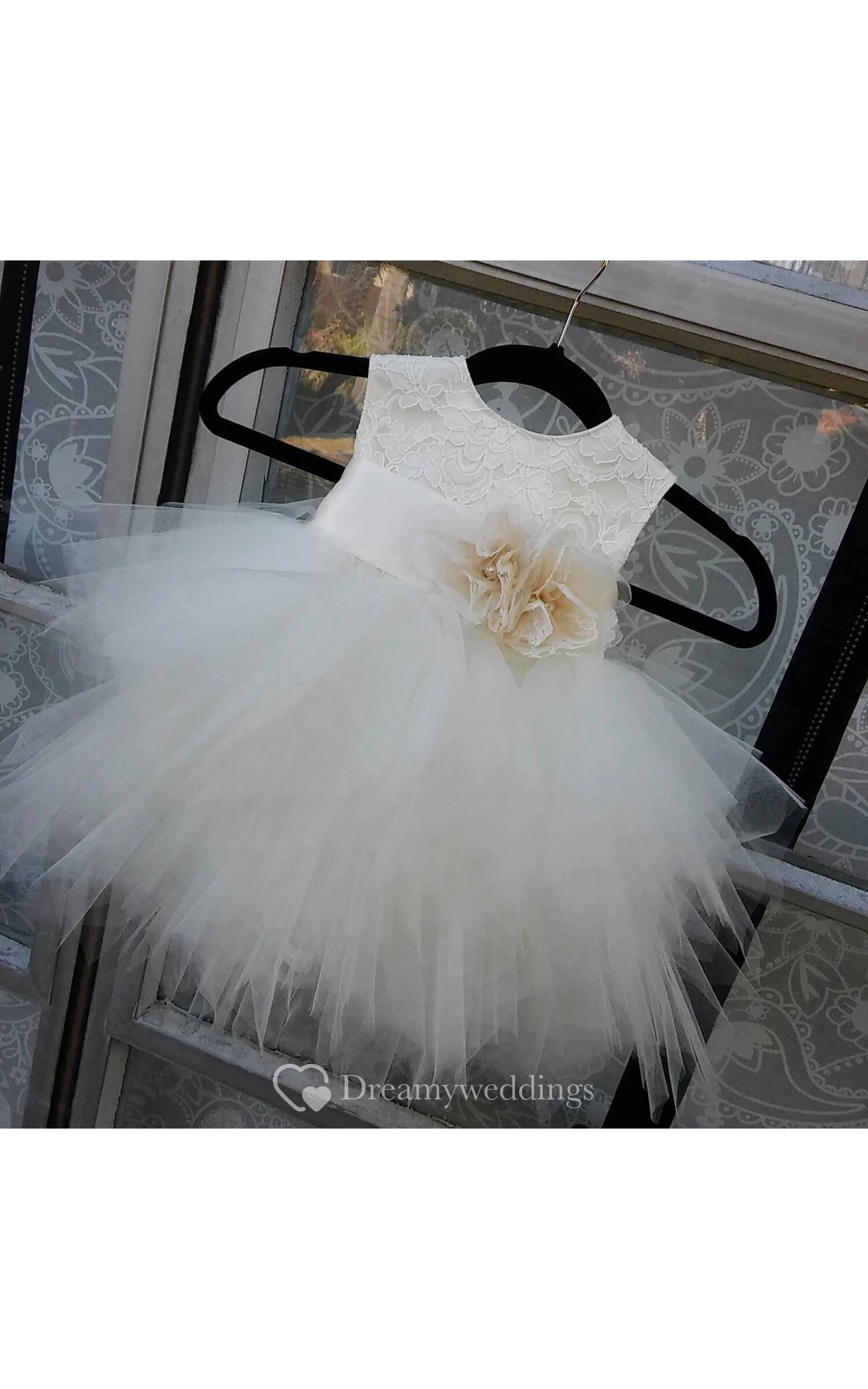 Scoop Neckline Layered Tulle Ball Gown With Waist Flower
