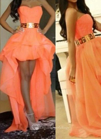 Sexy A-line Long Prom Dresses Sweetheart Asymmetrical Gold Belt Girls Hi-lo Evening Gown