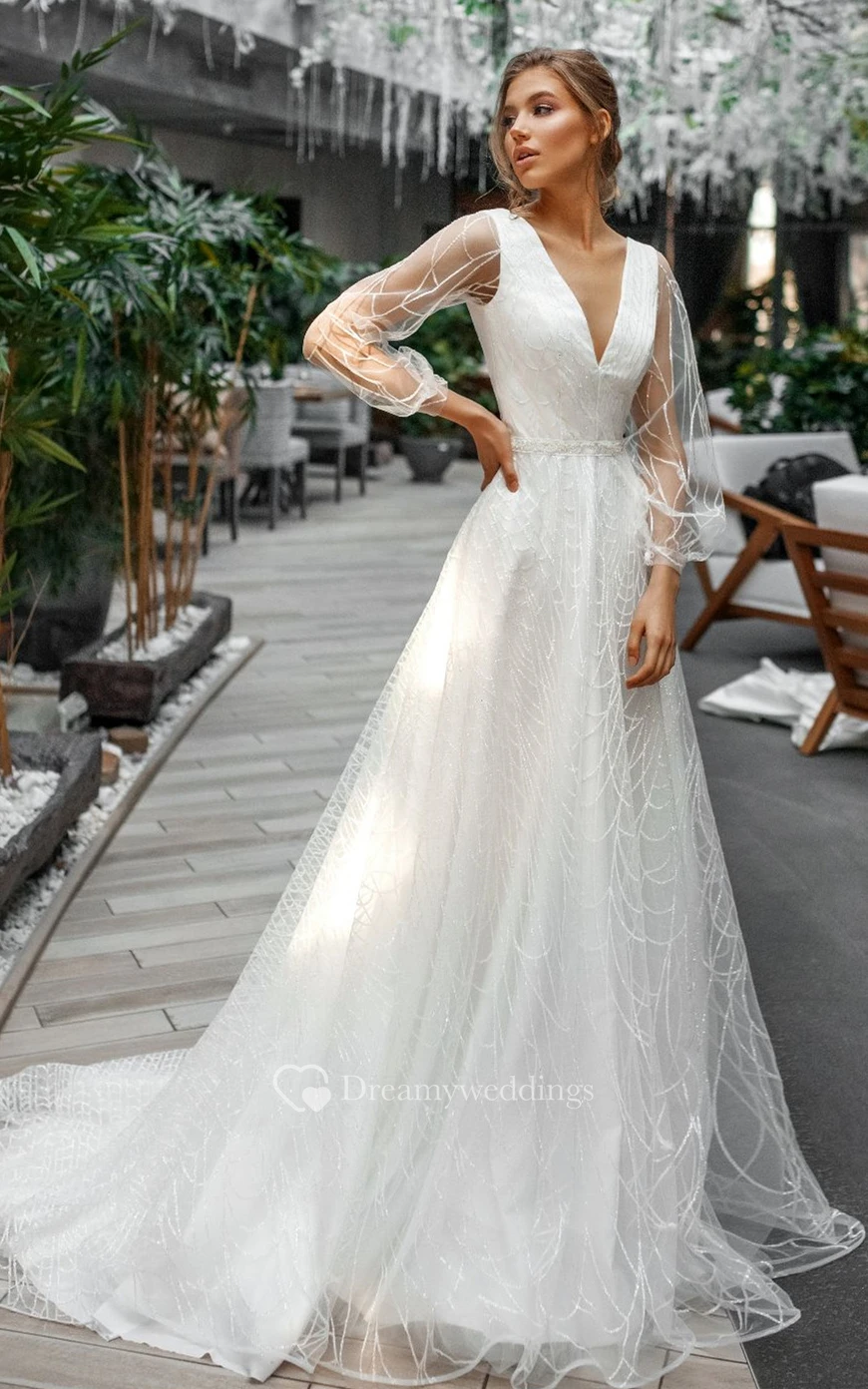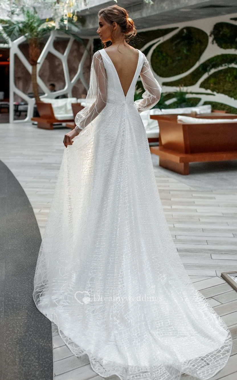 Sexy A Line Organza V-neck Court Train Wedding Dress with Ruching