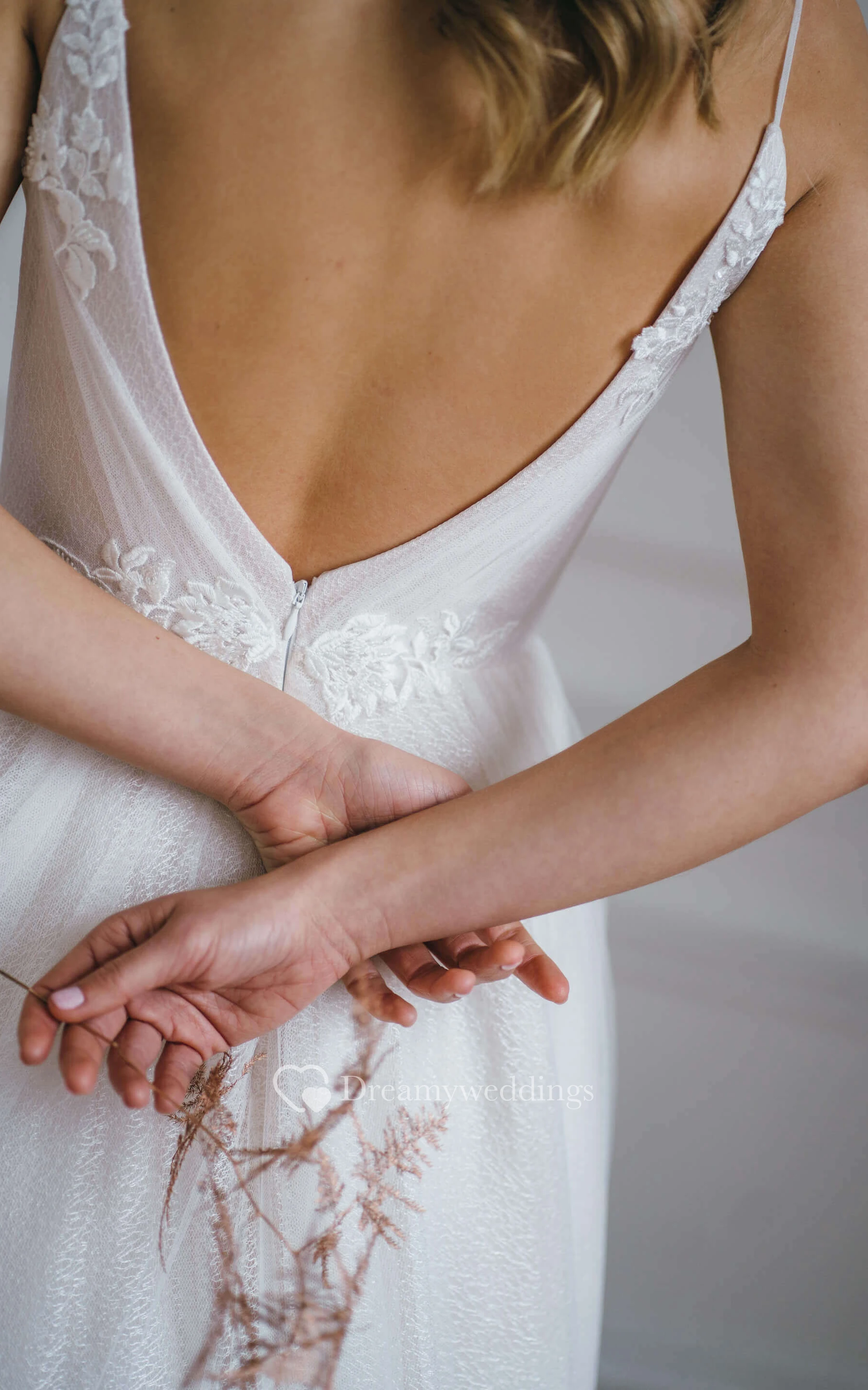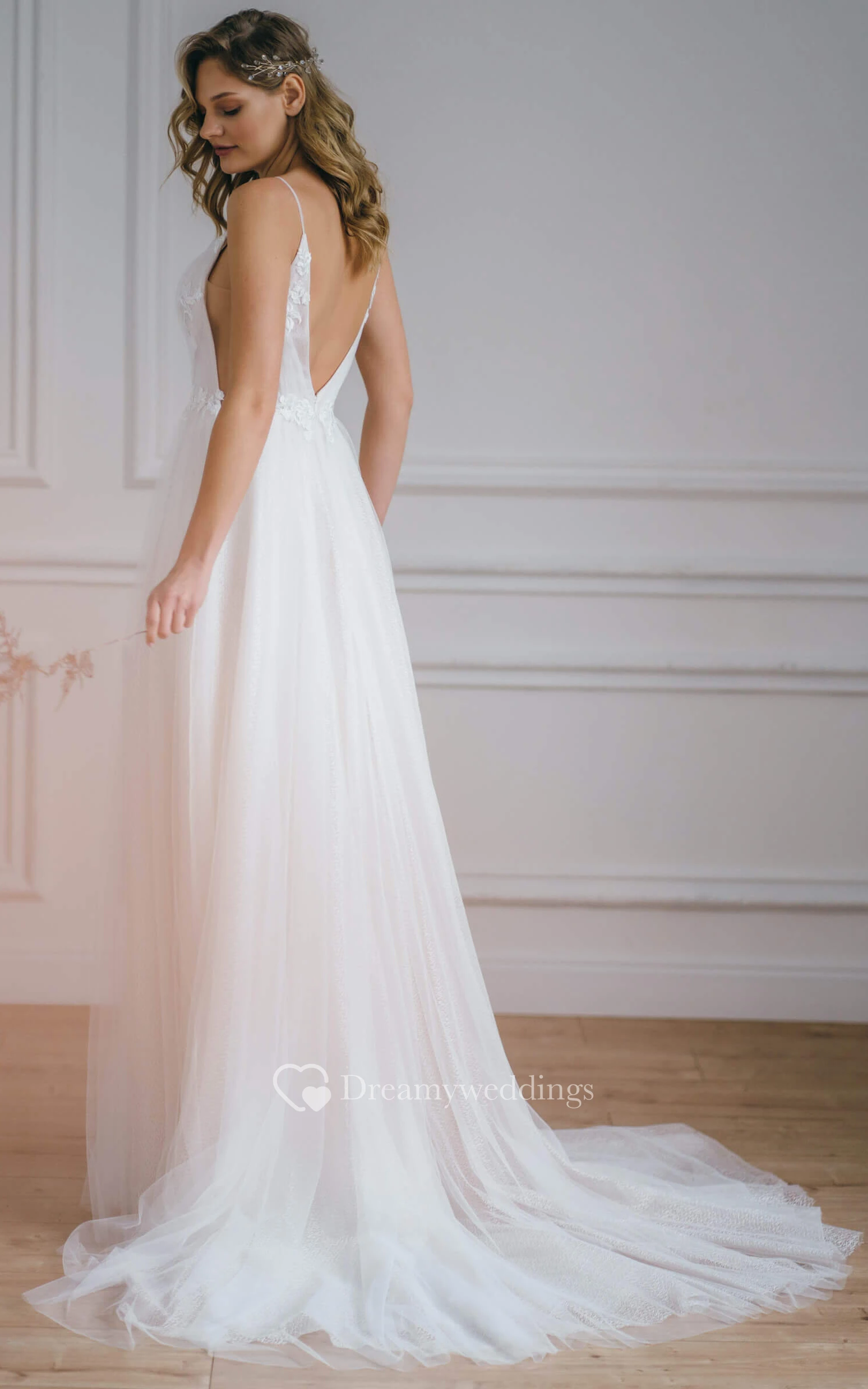 Sexy A Line Tulle Floor-length Sleeveless Deep-V Back Wedding Dress with Appliques