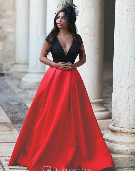 Sexy Balack and Red Short Sleeve Evening Dresses Taffeta A-Line Evening Party Gown