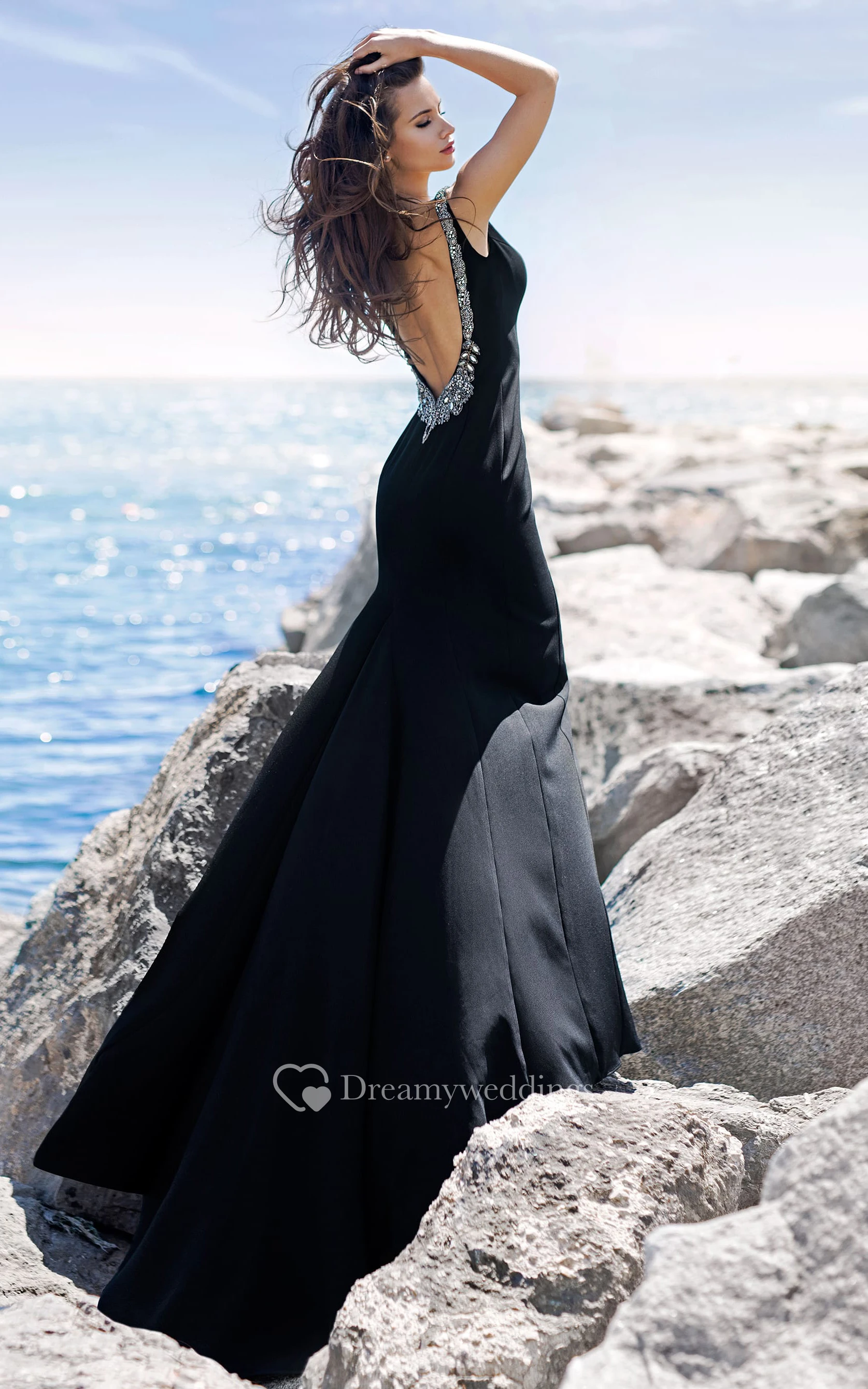 Sexy Bateau Satin Mermaid Sleeveless Sweep Train Evening Dress with Beading and Split Front
