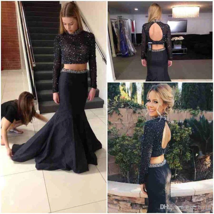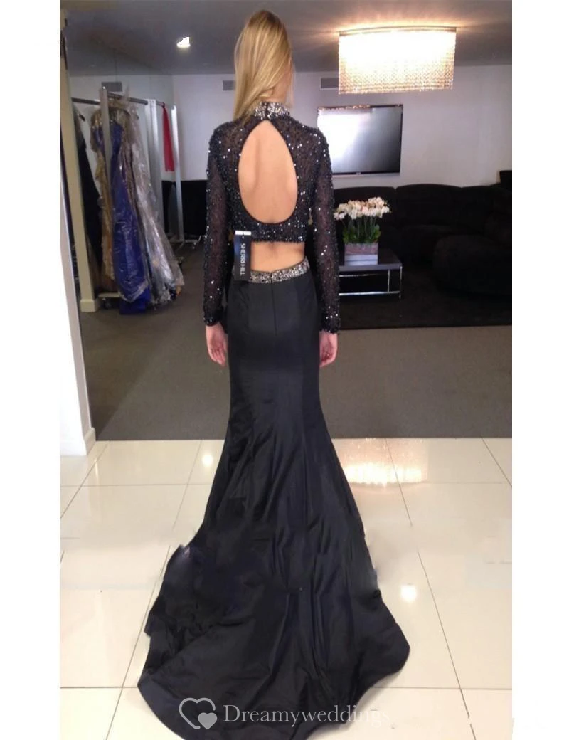Sexy Beadings Black Two Piece Evening Dress Long Sleeve Mermaid High Neck