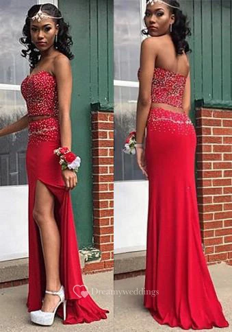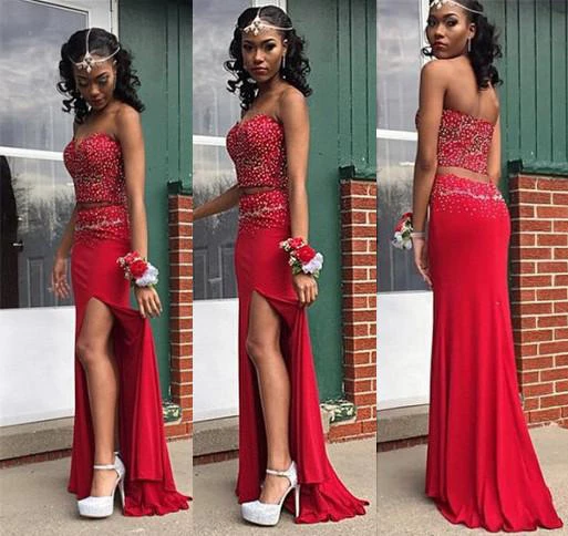 Sexy Beadings Front Split Red Prom Dress Two Piece