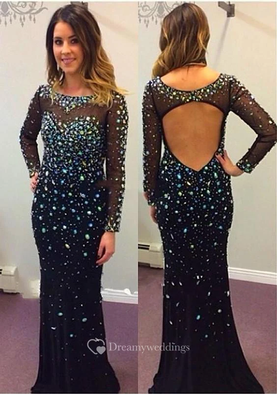 Sexy Black Long Sleeve Prom Dresses Crystals Long