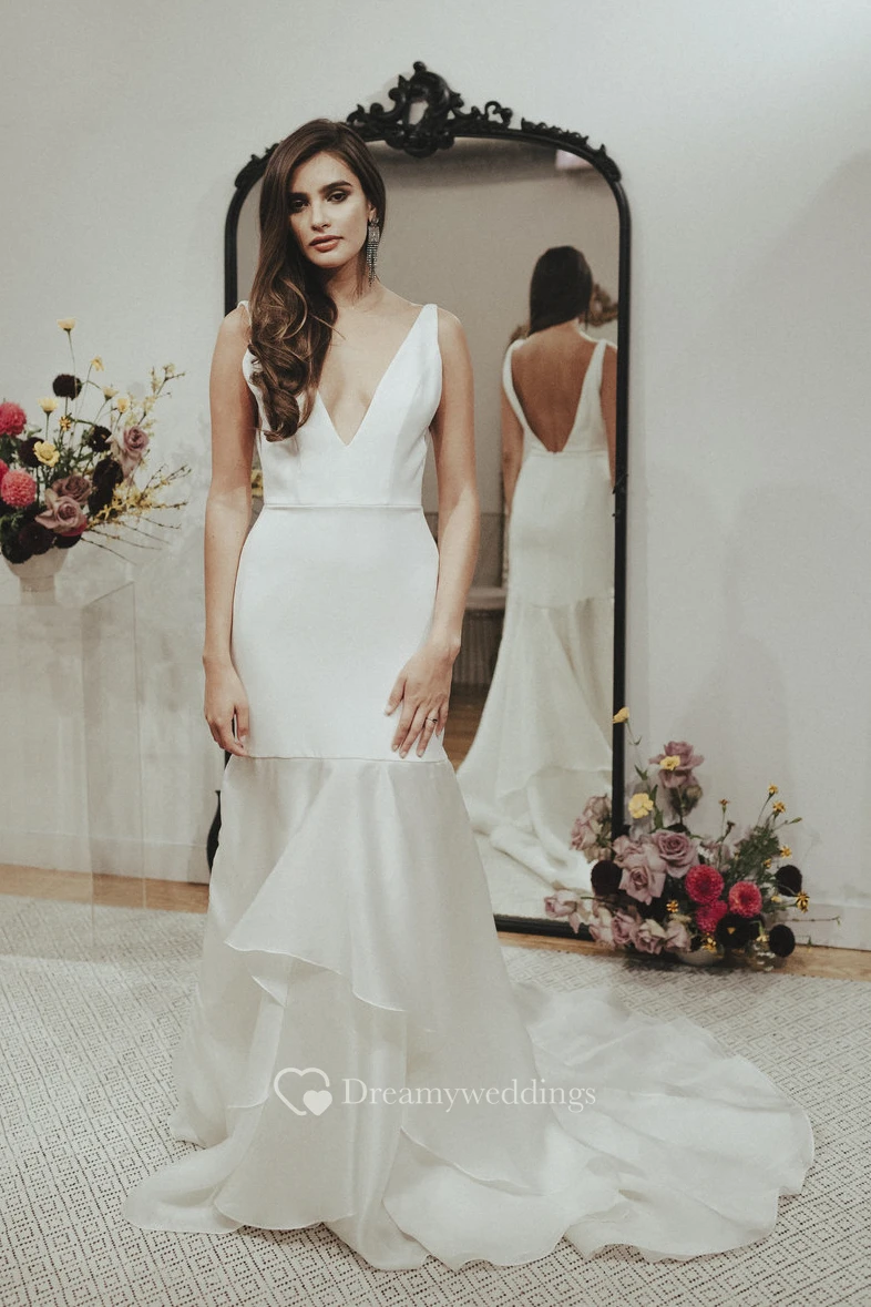 Sexy Deep V-neck Deep V-back Satin Wedding Dress With Tiers