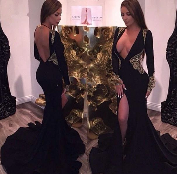 Sexy Gold and Black Long Sleeve Prom Dresses Mermaid Deep V-neck