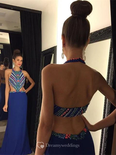 Sexy Halter Colorful Crystals Evening Dress Sweep Train Sleeveless