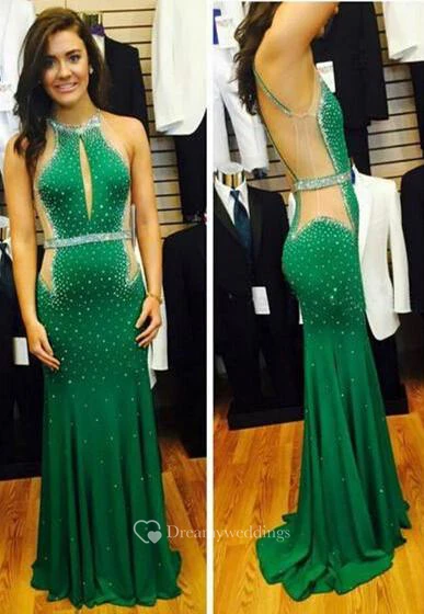 Sexy Halter Mermaid Beadings Green Prom Dress Sweep Train