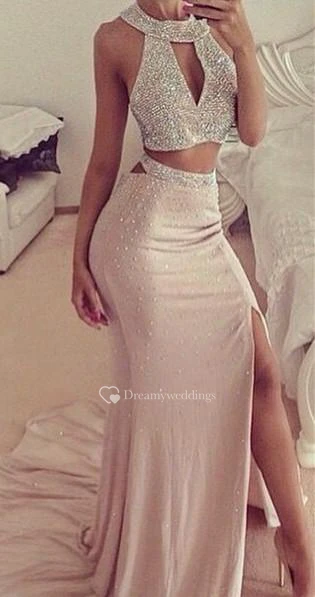 Sexy Halter Sleeveless Prom Dress With Front Split Beadings