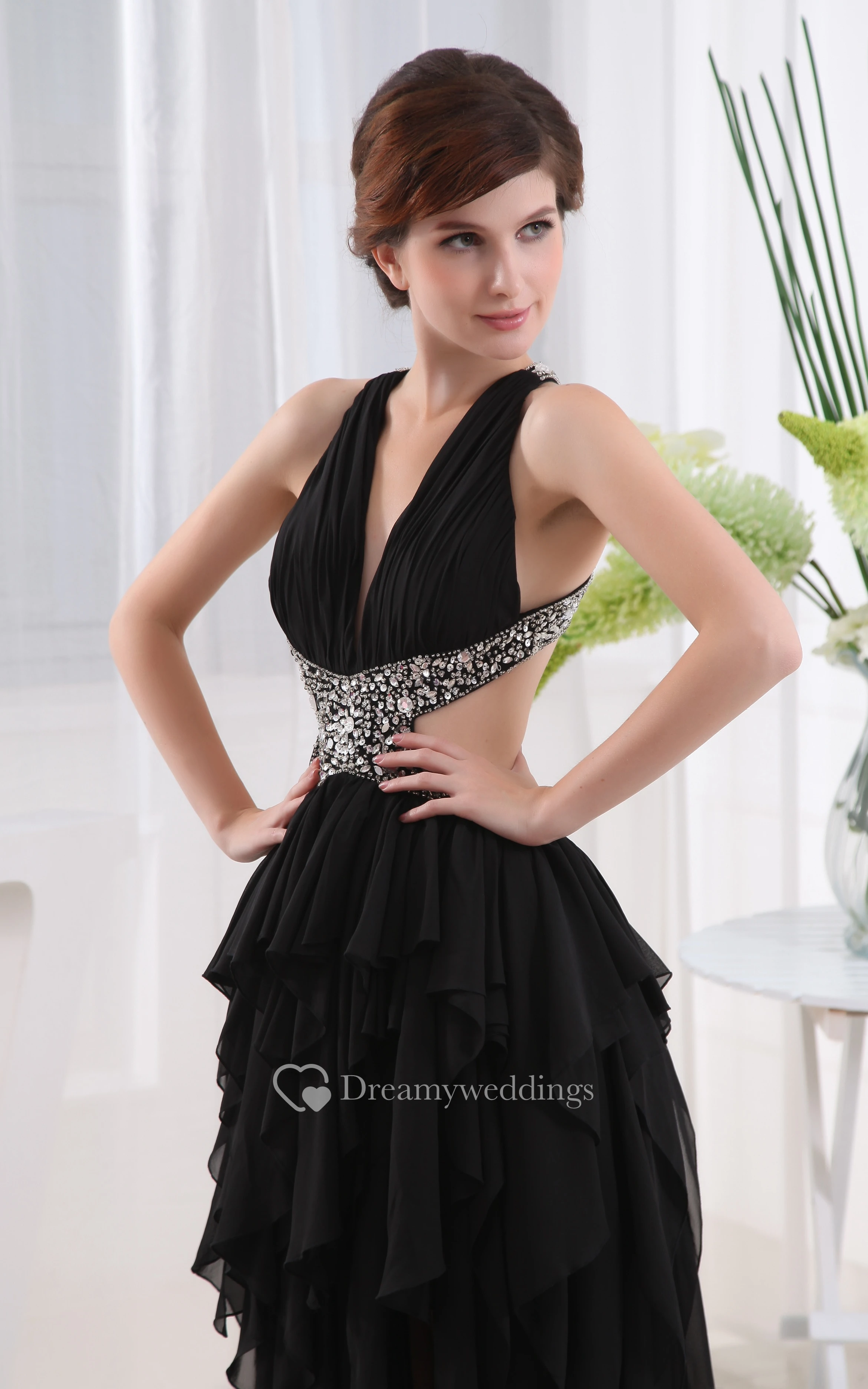 Sexy High-Low Ruched Dress With Beading and Keyhole