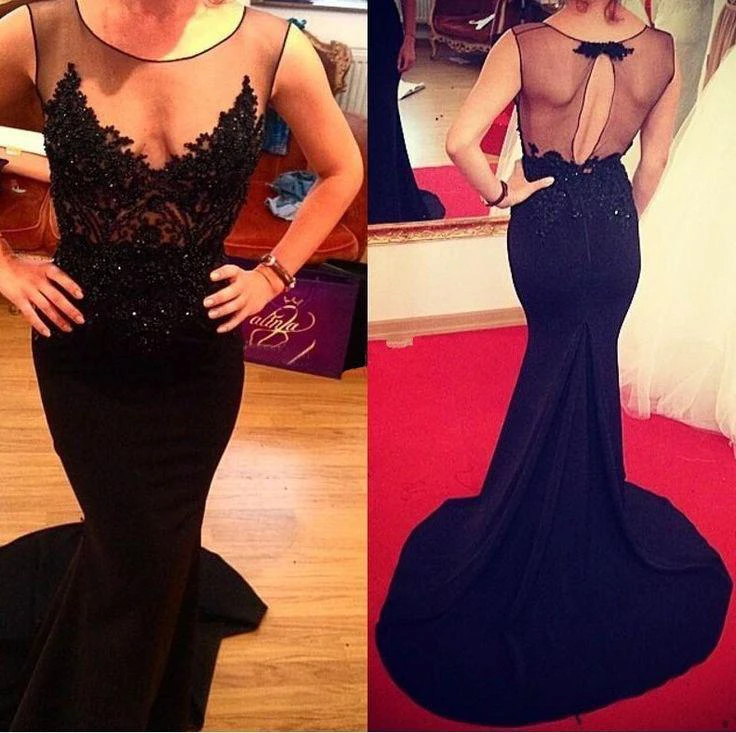 Sexy Illusion Appliques Mermaid Prom Dress Sweep Train