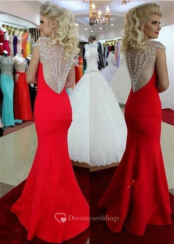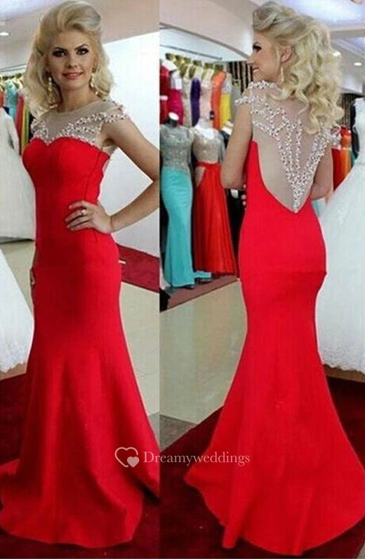Sexy Illusion Cap Sleeve Mermaid Prom Dress Beadings