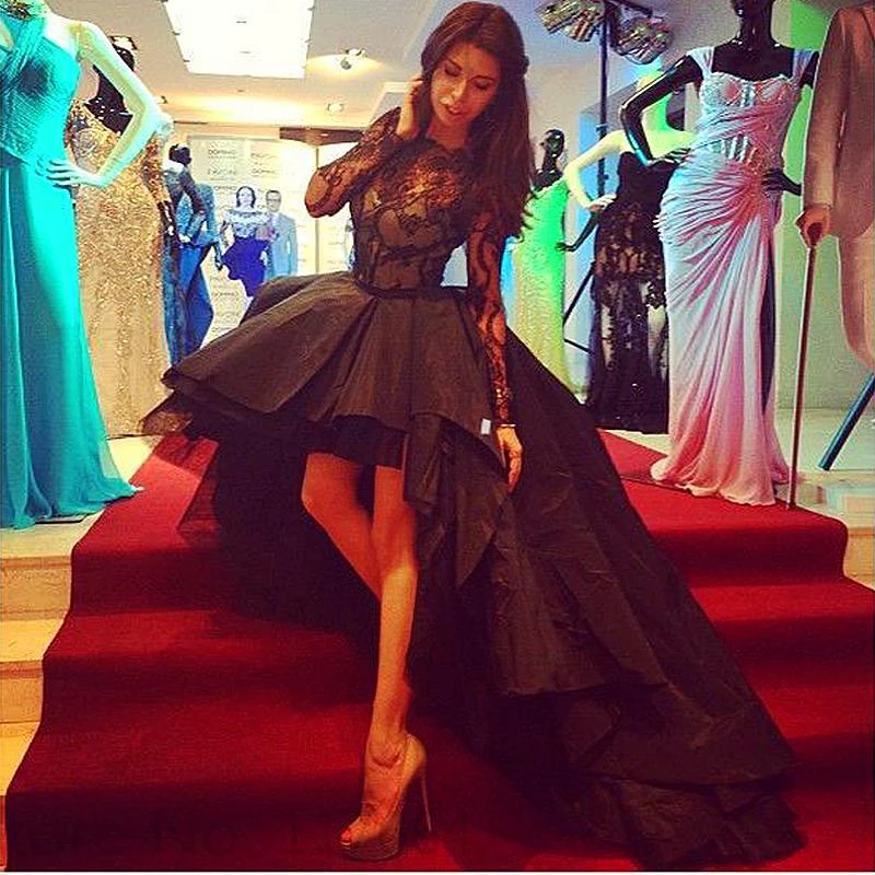 Sexy Jewel Hi-Lo Black Prom Dress Long Sleeve With Lace