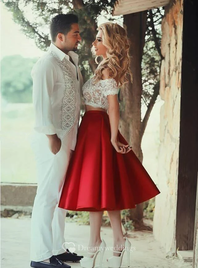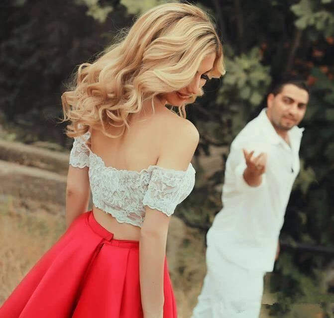 Sexy Lace Tea-length Two Piece Prom Dress Off-the-shoulder A-line
