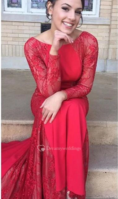 Sexy Mermaid Lace Jewel Red Evening Dress Long Sleeve Sweep Train